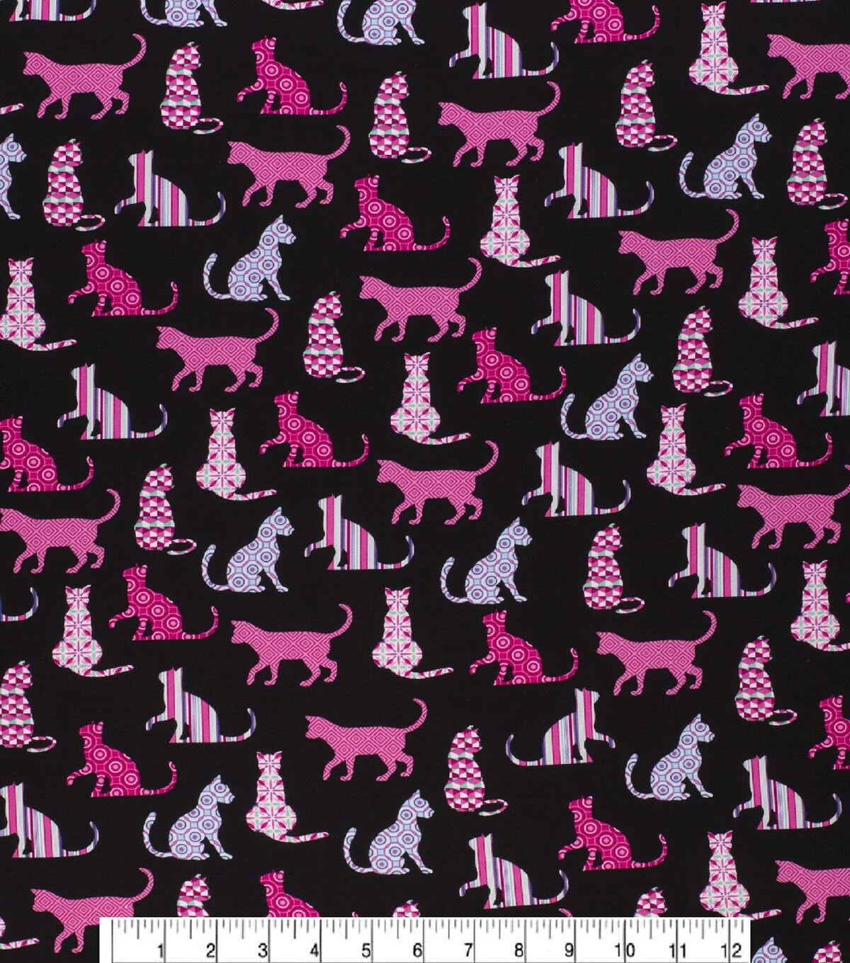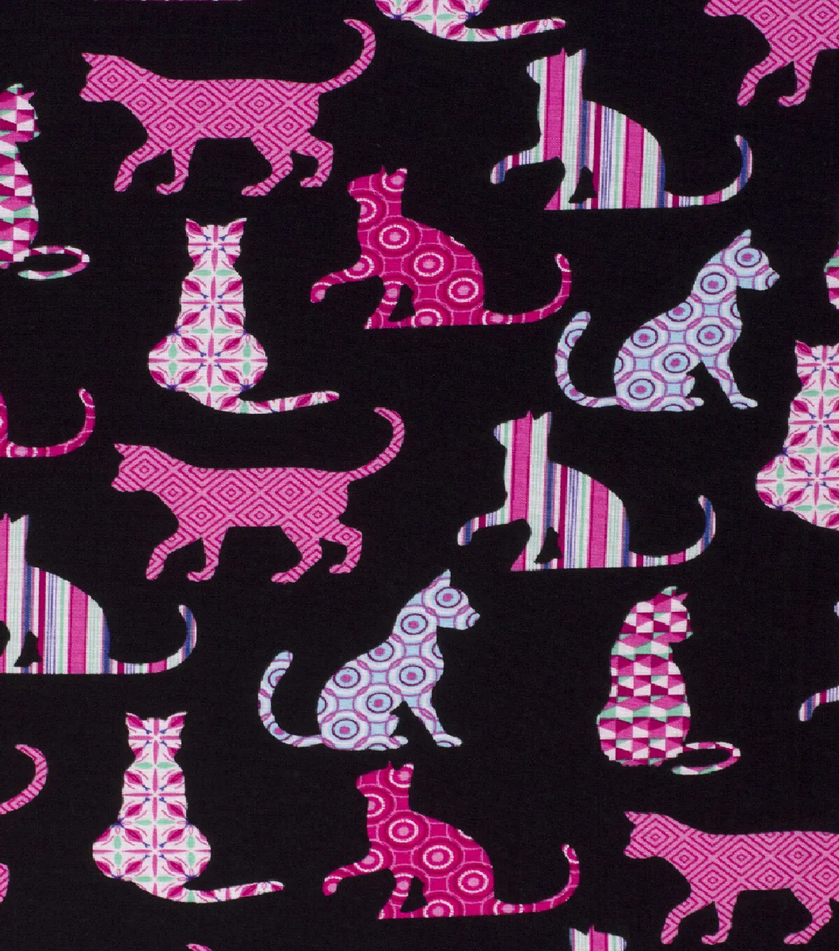 Novelty Cotton Fabric Patterned Pink Cats on Black