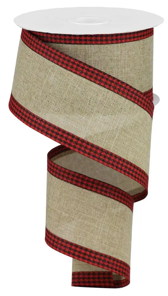 Wired Ribbon Royal Burlap Gingham Edge for Wreaths, Floral Arrangements, Gift Wrapping, Crafting (Light Beige, Red, Black, 2.5)