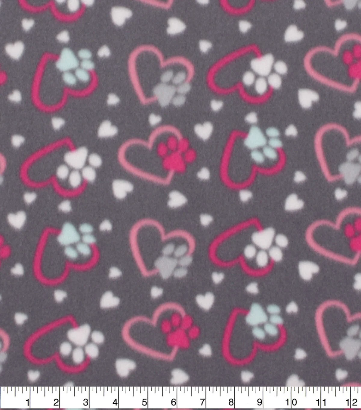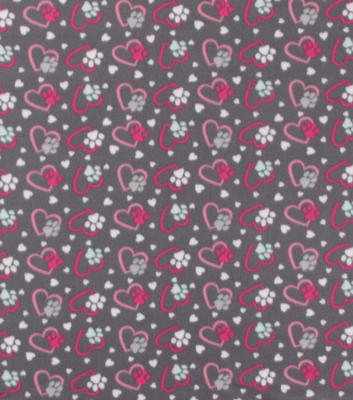 Blizzard Fleece Fabric Pink Gray Paws And Hearts