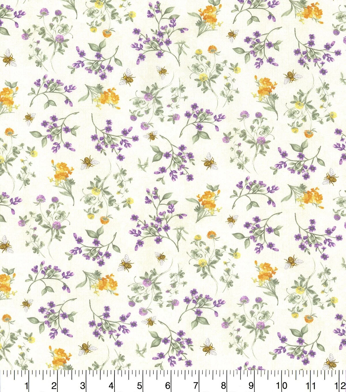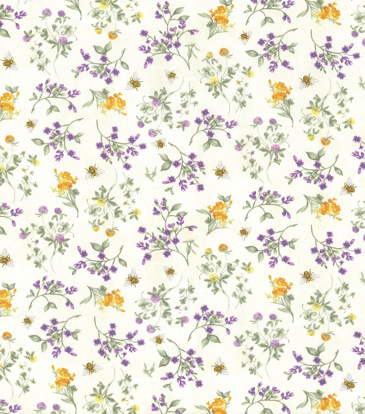 Hi Fashion Bee & Lavender on White Premium Cotton Fabric