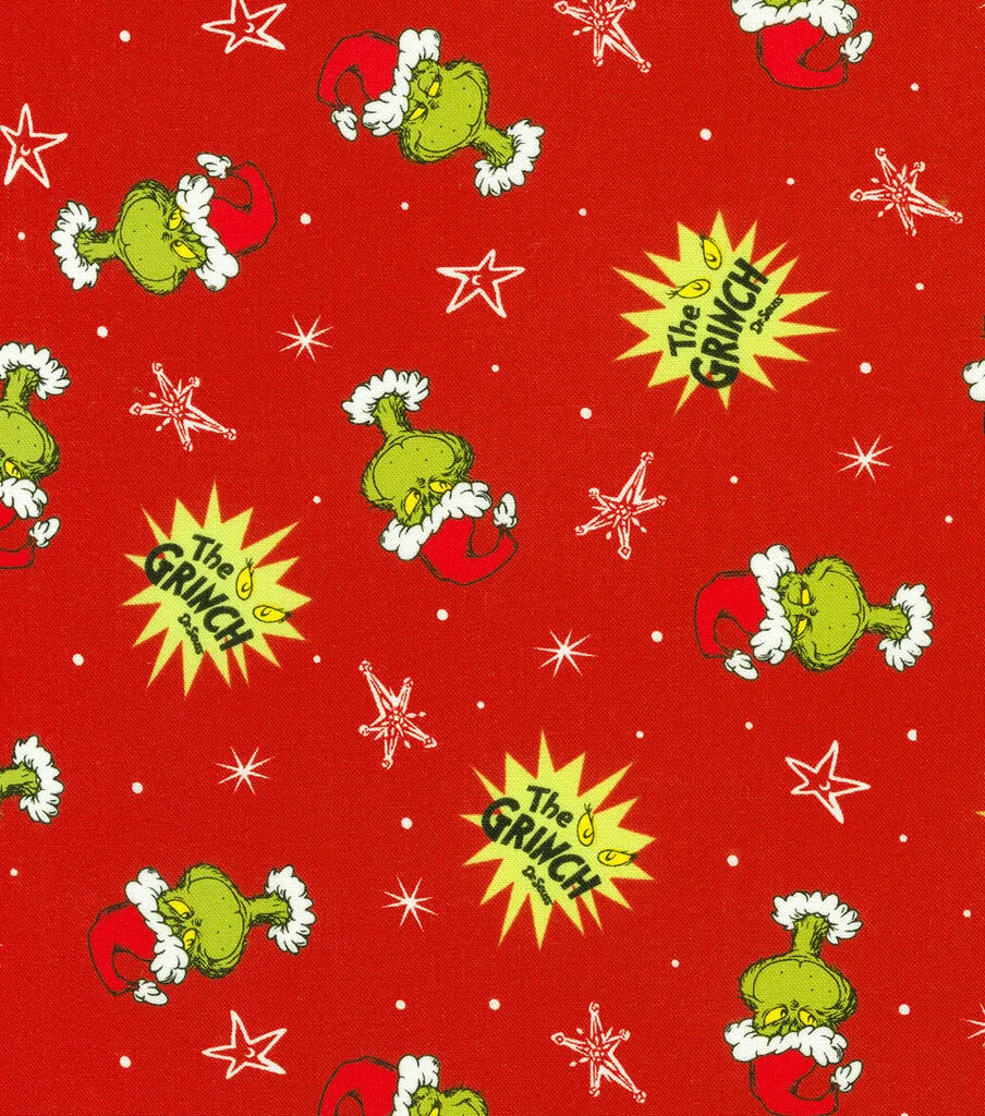 Grinch Heads & Dots on Red Christmas Cotton Fabric
