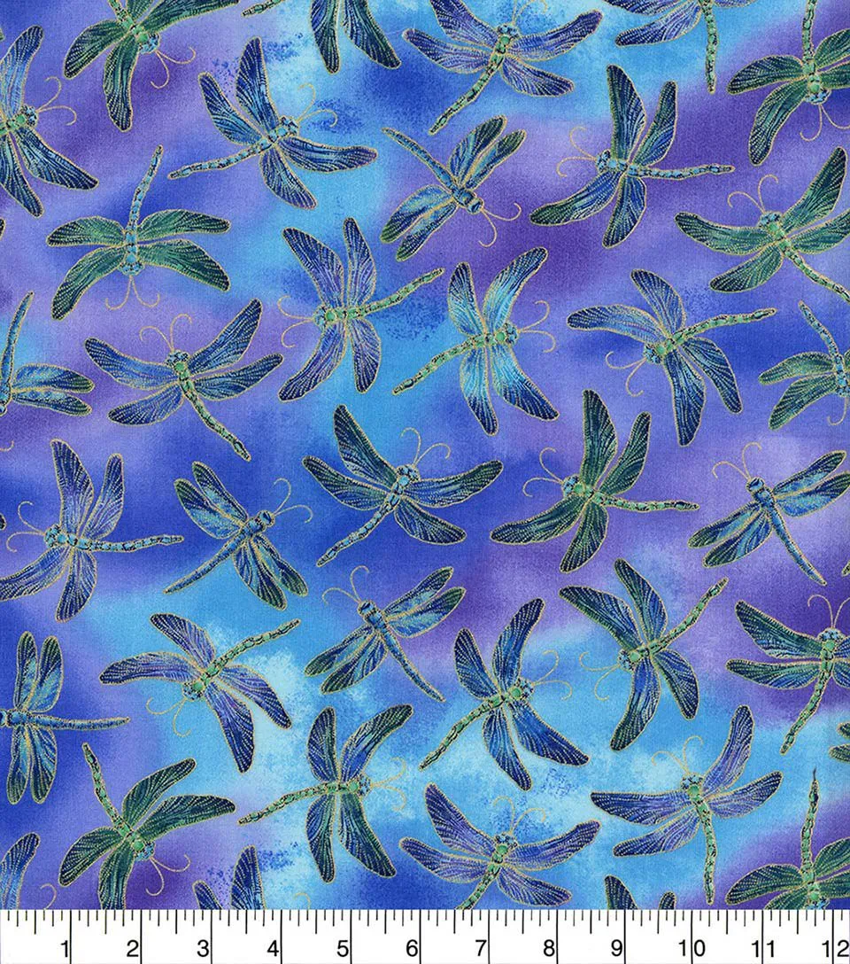Hi Fashion Flying Dragonflies on Blue Novelty Metallic Cotton Fabric