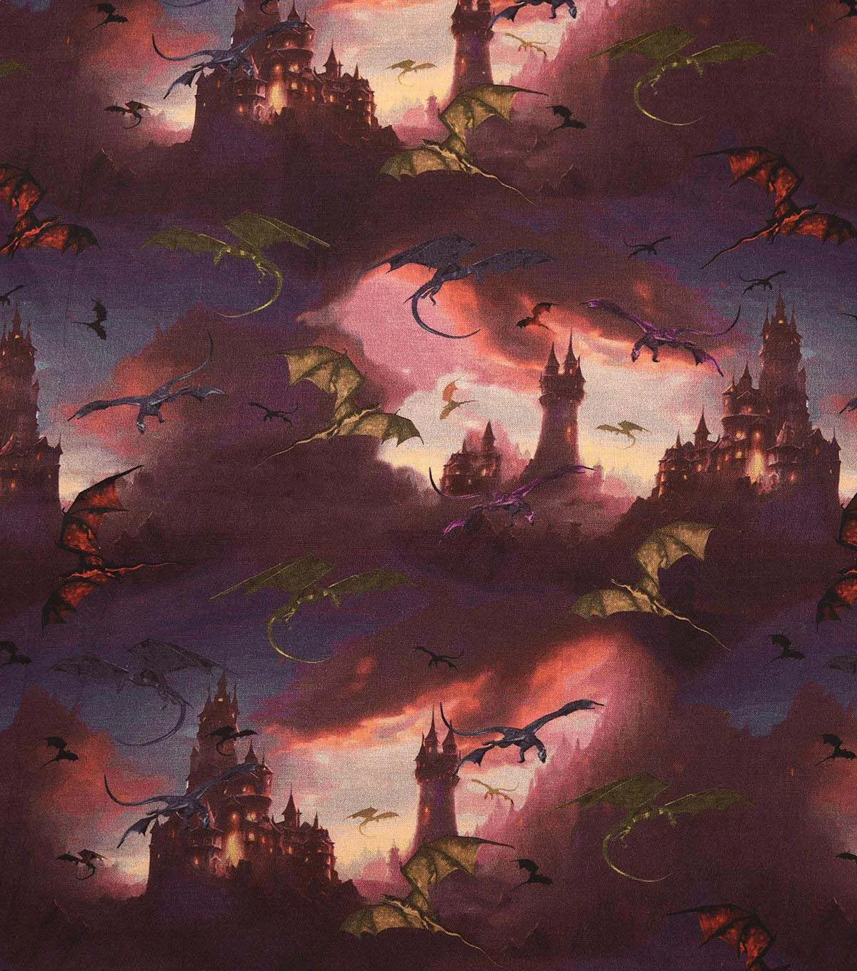 Dragons & Castles on Dark Blue Novelty Cotton Fabric