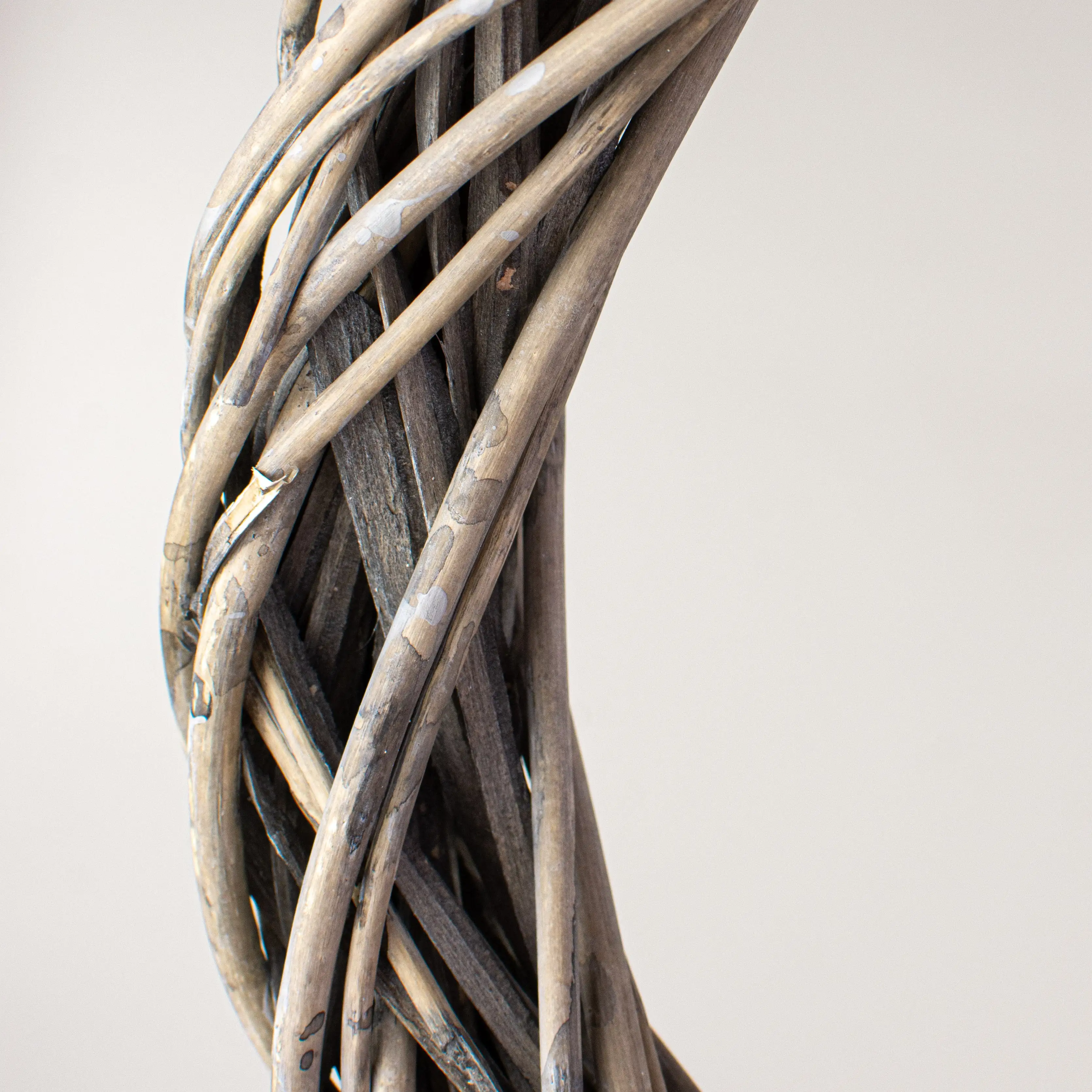 This wreath has white-washed grey willow vines that twist in, out and around a base of the same material. The resulting effect looks almost woven and makes it easy to insert floral stems directly into the spaces in between. The neutral color lends this wreath for decorating in any season.