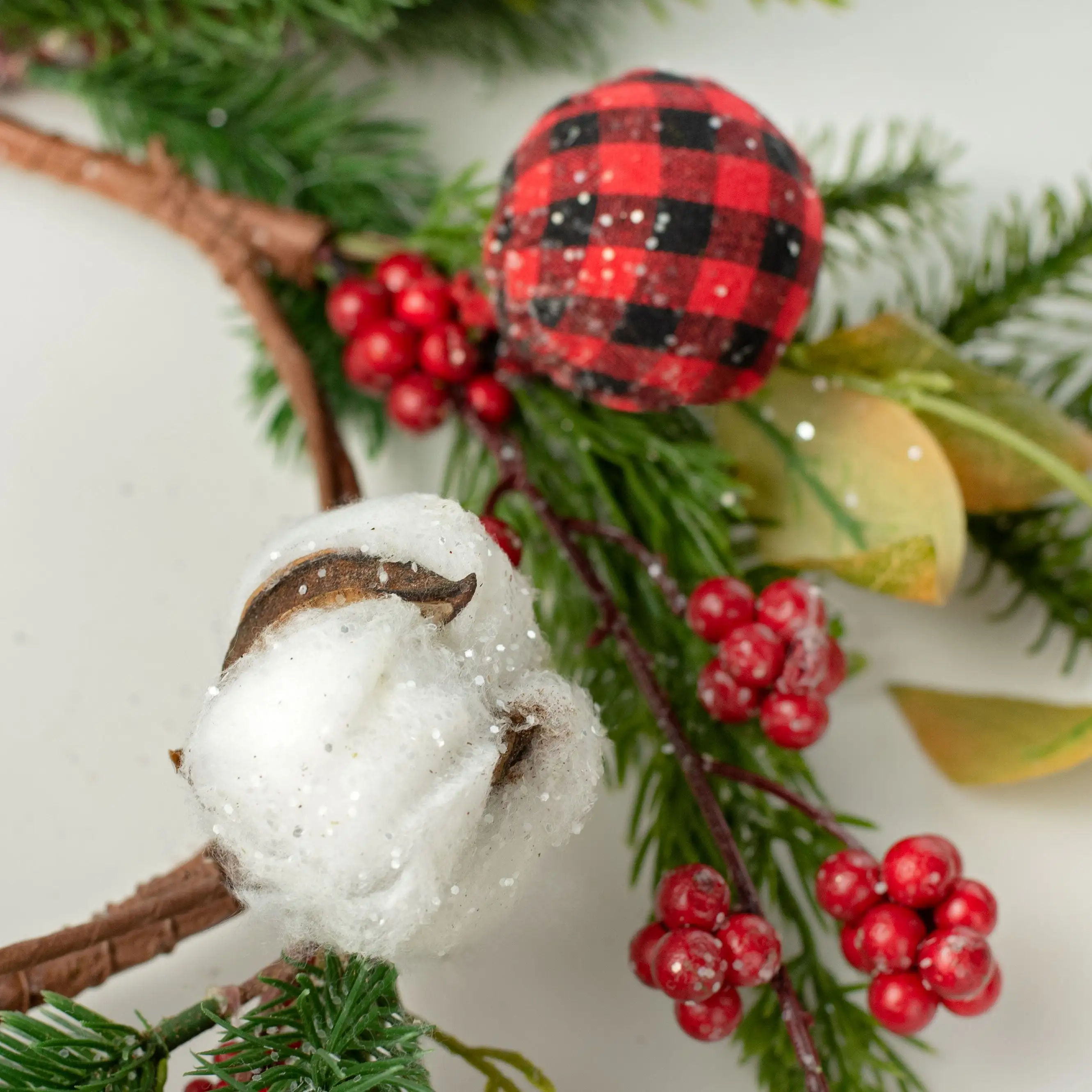 This small holiday wreath is appropriately sized for use on windows, shutters, and other narrow spaces, and doubles as a candle ring. Glittered cotton bolls, buffalo plaid fabric balls, and red berries are worked into two different types of pine as they stretch out from a central ring.