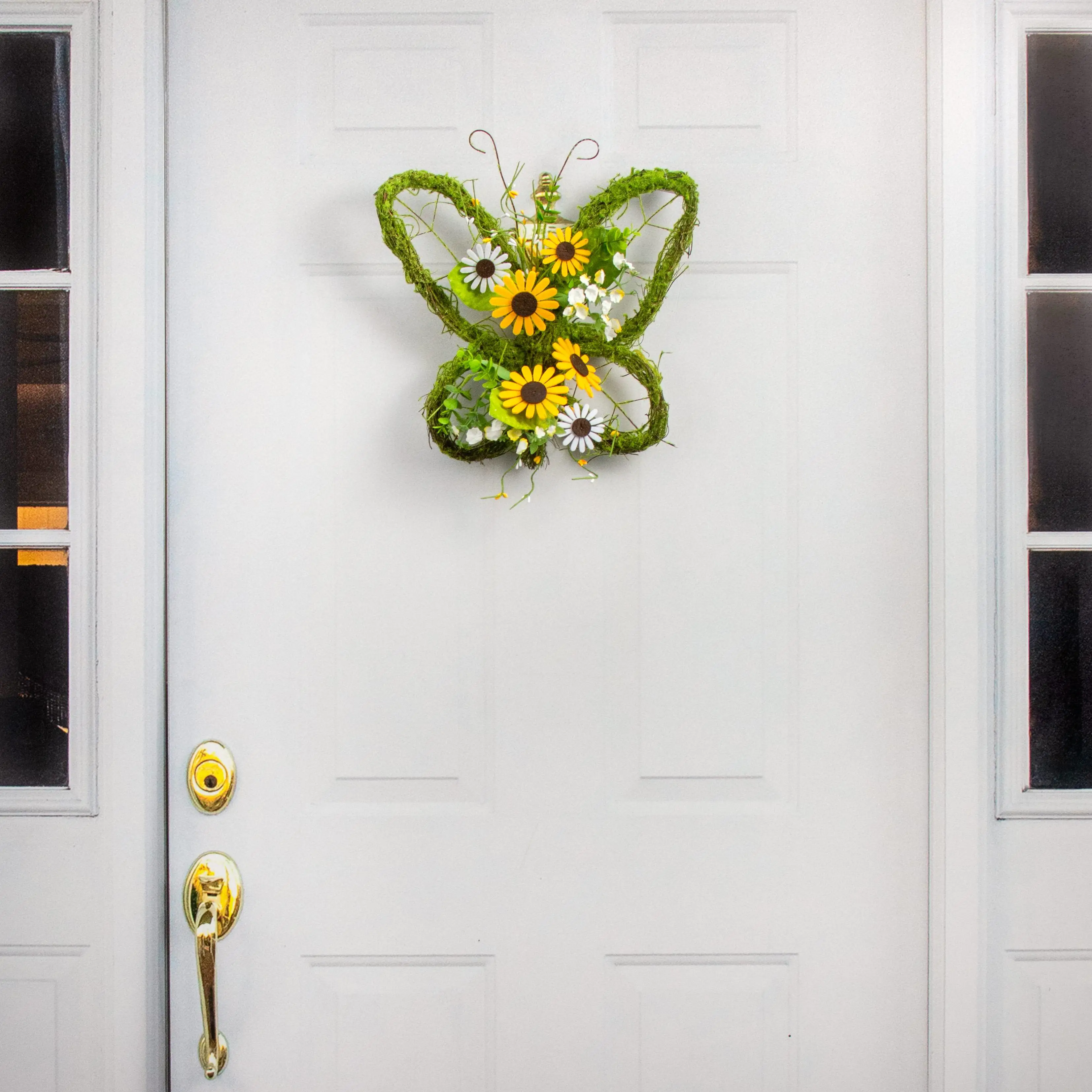 Natural grapevine is wrapped around a wire frame to form the shape of a butterfly. The grapevine is flocked with faux moss that matches the greens in the wreath's leaves and eucalyptus. Yellow and white felt sunflowers with brown centers join paper flowers and pips in the same colors. Each element is wired.