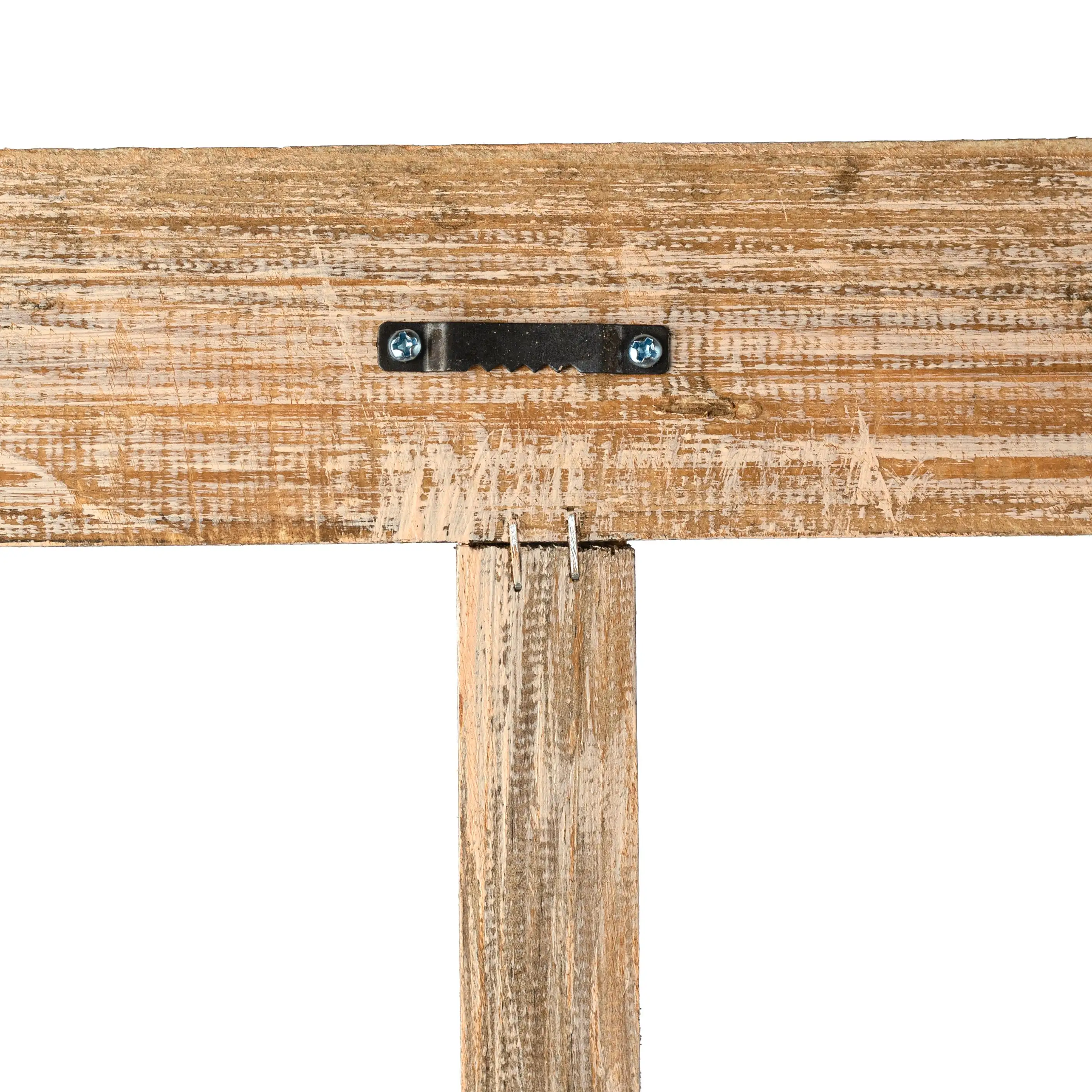 This faux window frame has four empty panes with an antique, farmhouse look. The beveled wood is brown with a wash of beige paint. It can be used as a base for florals, ribbons and small cabinet wreaths/candle rings.