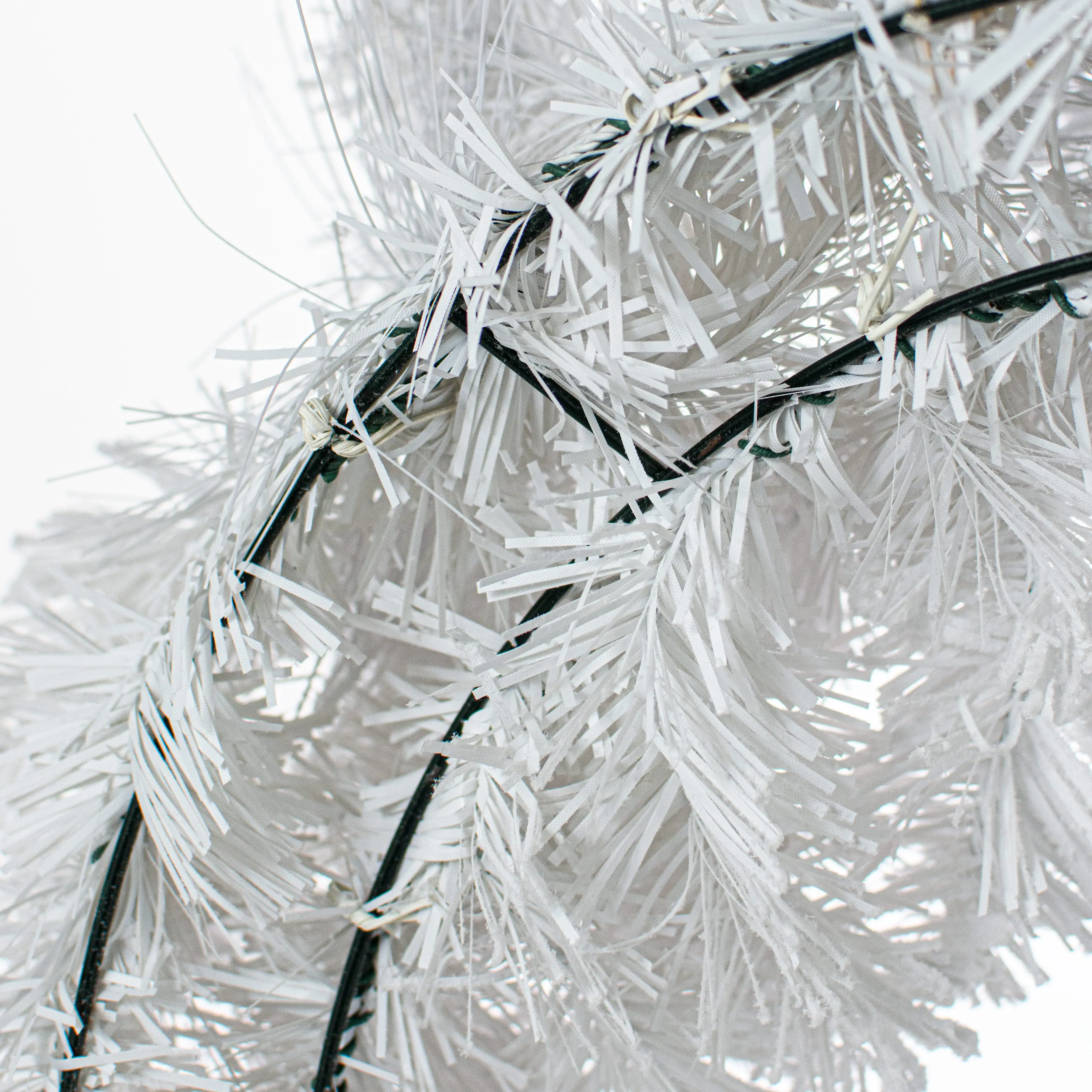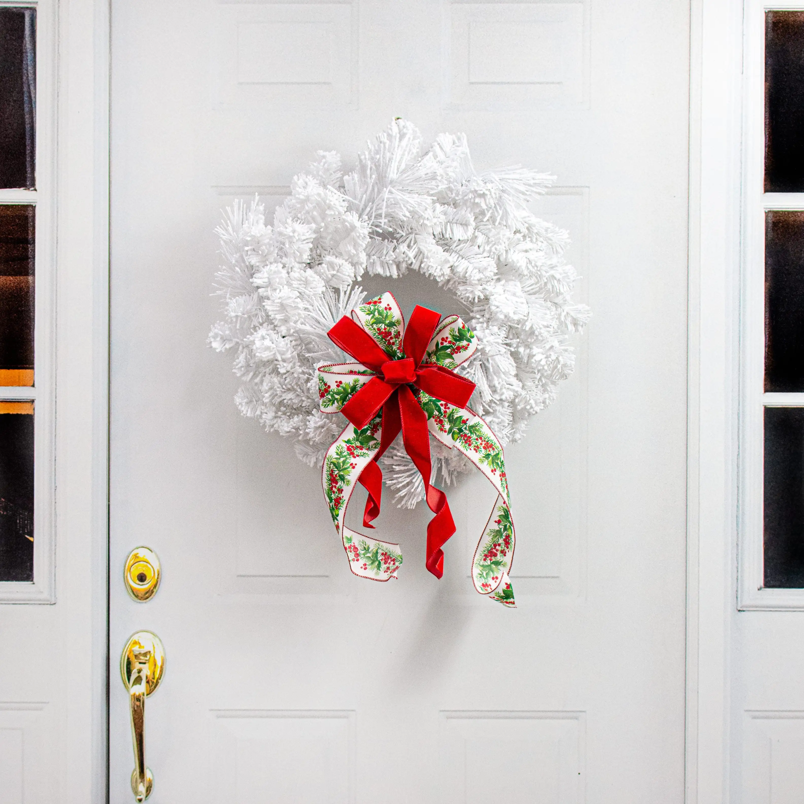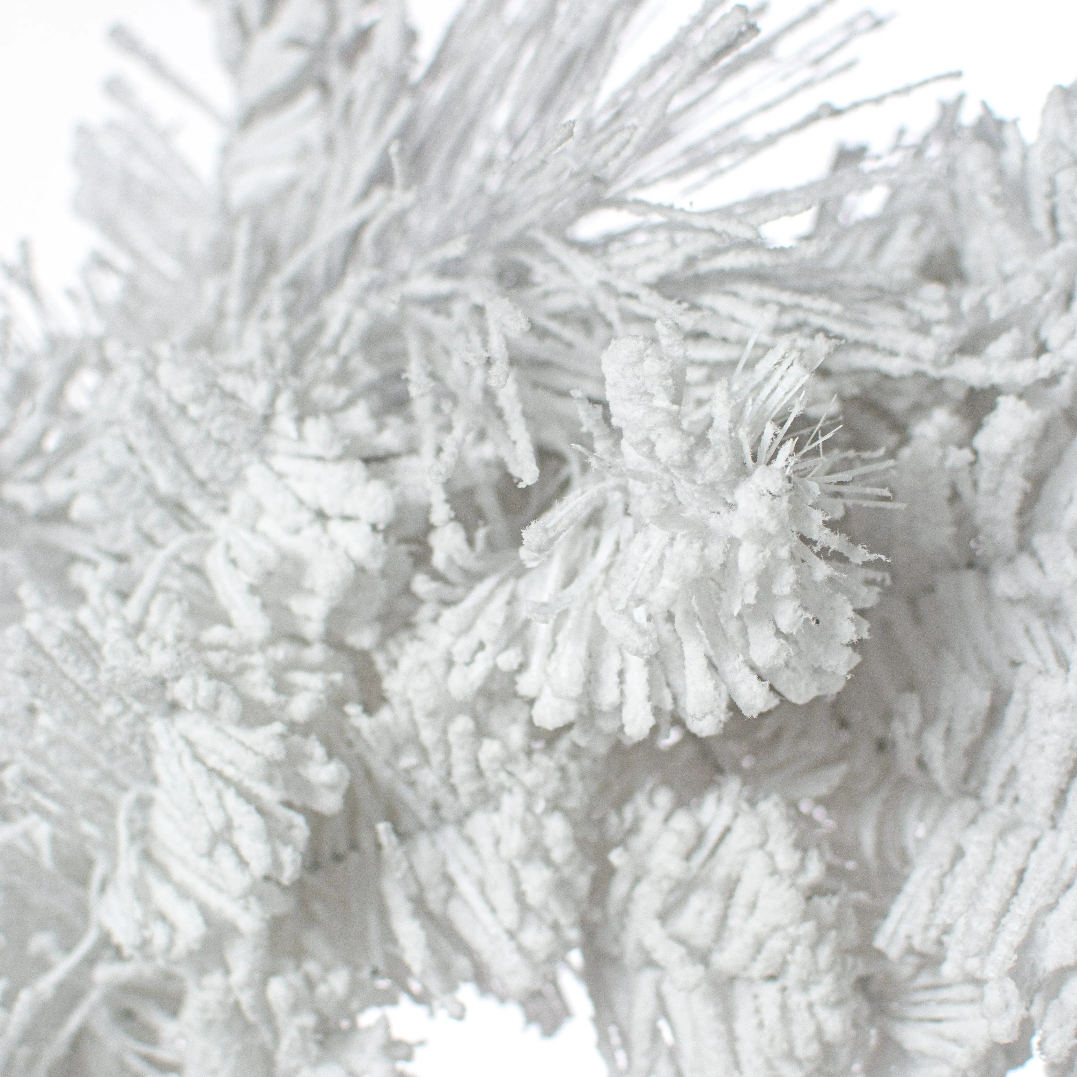This wreath has a standard metal base filled with two type of PVC and plastic white pine. The short and long needles are heavily flocked on one side. The wreath is 22" as shown - fluff out the wired pine pieces for a less full, but wider appearance.