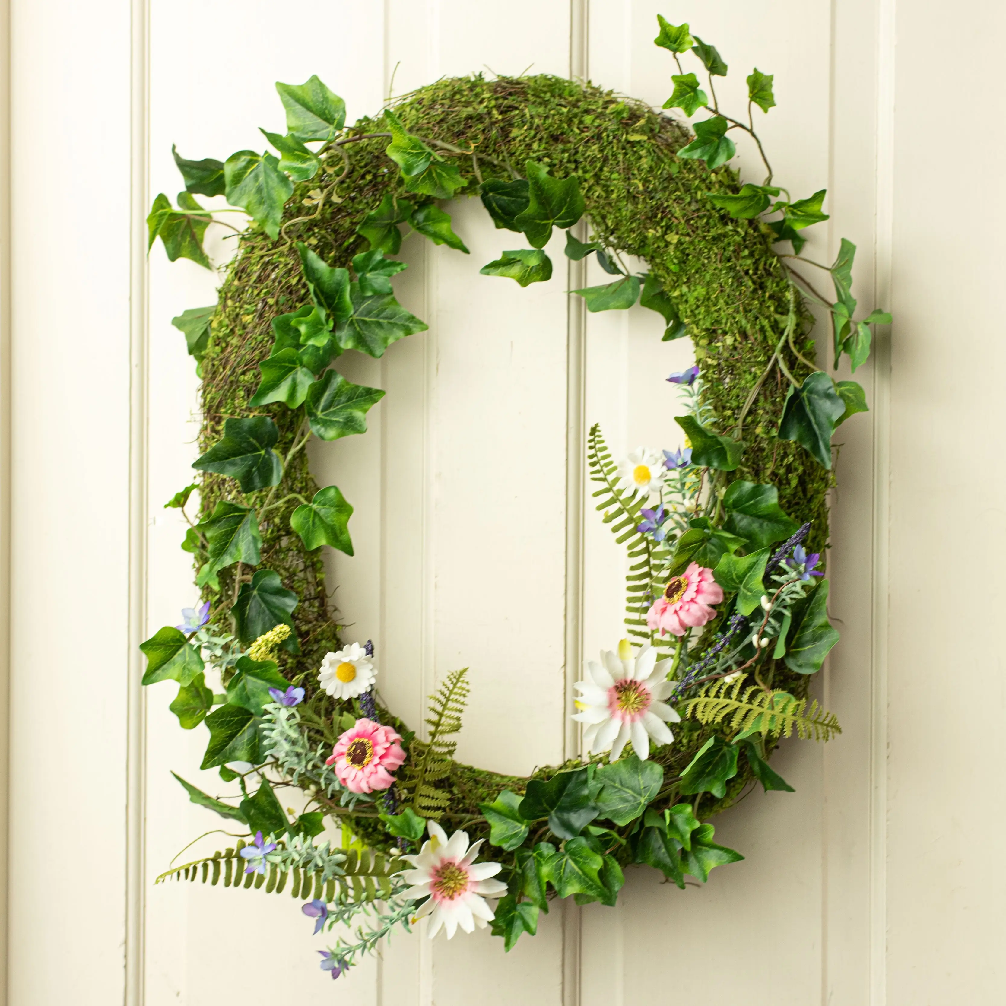 This long oval wreath has a springtime woodland look. Its lightweight frame is covered in dense angel vine and flocked with faux moss and lichen. The frame is flat on the back so the wreath lays nicely against doors and walls.