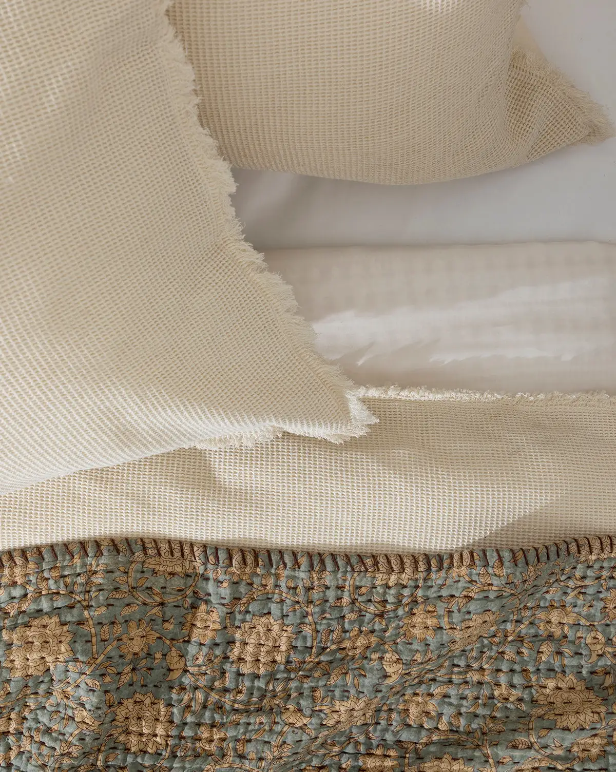 With a bold floral pattern, the Gabriella Block Print Quilt is a cotton quilt that layers both character and texture into your bedding textiles. Made from 100% cotton that is block printed and filled with a double layer of flannel, the cotton quilt adds colorful detail to your bedroom decor.