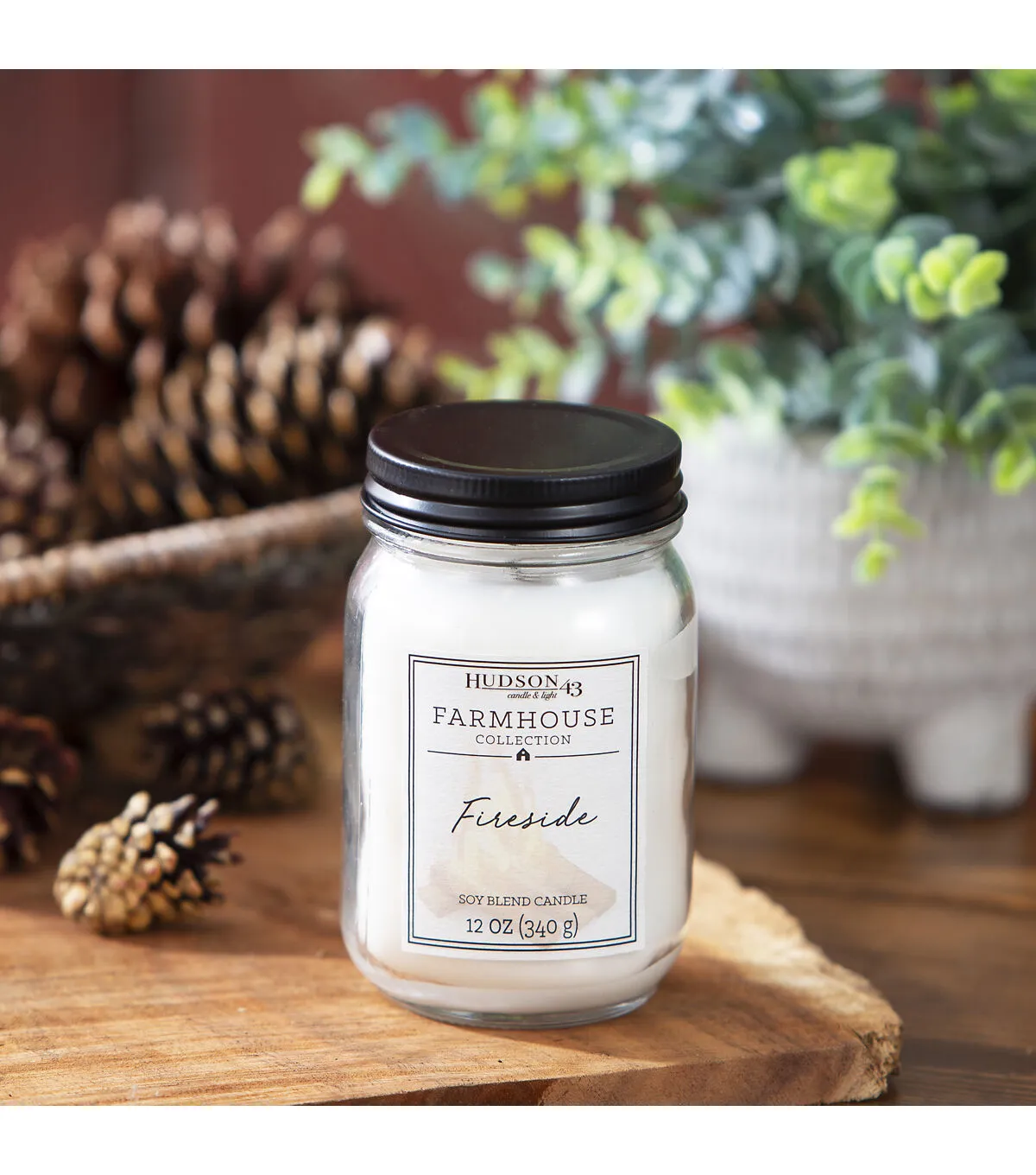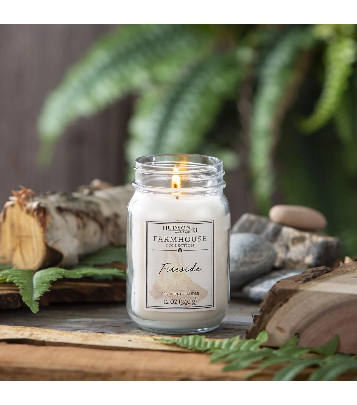 The Hudson 43 Farmhouse Collection Fireside Mason Jar Candle offers a modern yet rustic fragrance in a beautiful package that goes with any decor. This 12-ounce clear mason jar comes with a white wax candle and a matte black lid that screws on. It includes the notes of smoke, spice and firewood.