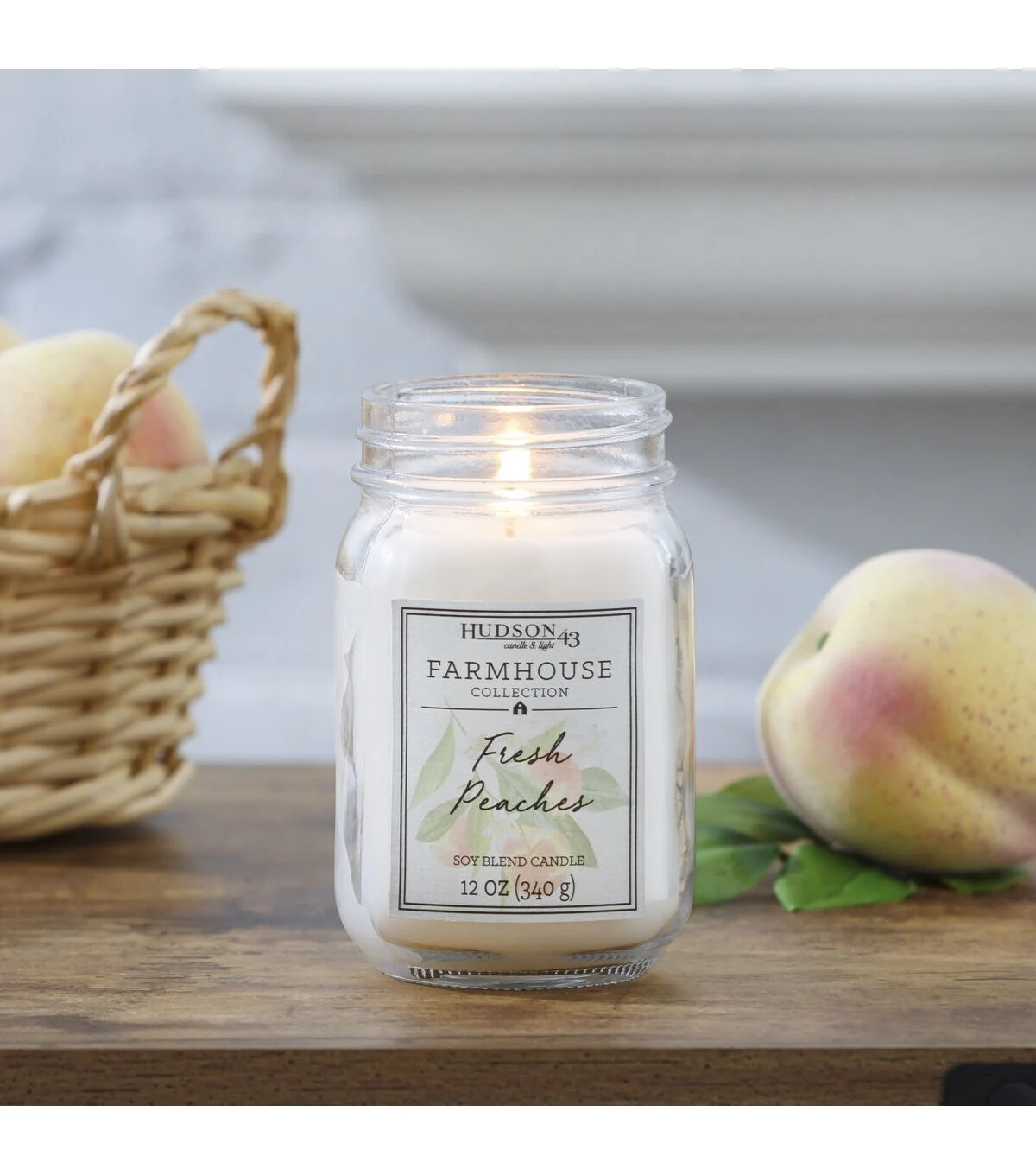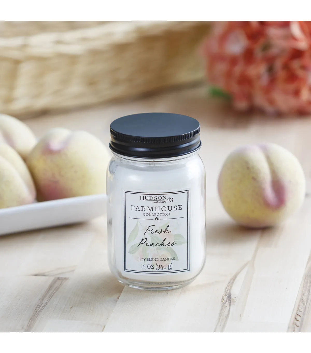 The Hudson 43 Farmhouse Collection Fresh Peaches Mason Jar Candle offers a modern yet rustic fragrance in a beautiful package that goes with any decor. This 12-ounce clear mason jar comes with a white wax candle and a matte black lid that screws on. It includes the notes of sun-kissed peaches.