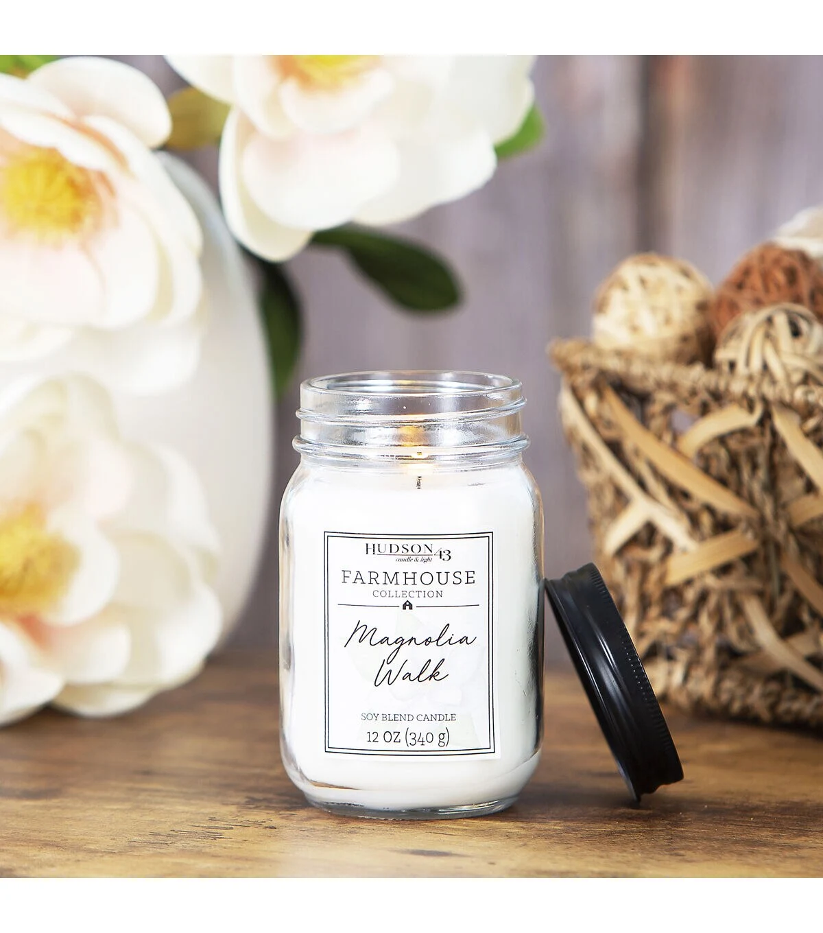 The Hudson 43 Farmhouse Collection Magnolia Walk Mason Jar Candle offers a modern yet rustic fragrance in a beautiful package that goes with any decor. This 12-ounce clear mason jar comes with a white wax candle and a matte black lid that screws on. It includes the notes of delicate magnolia petals.