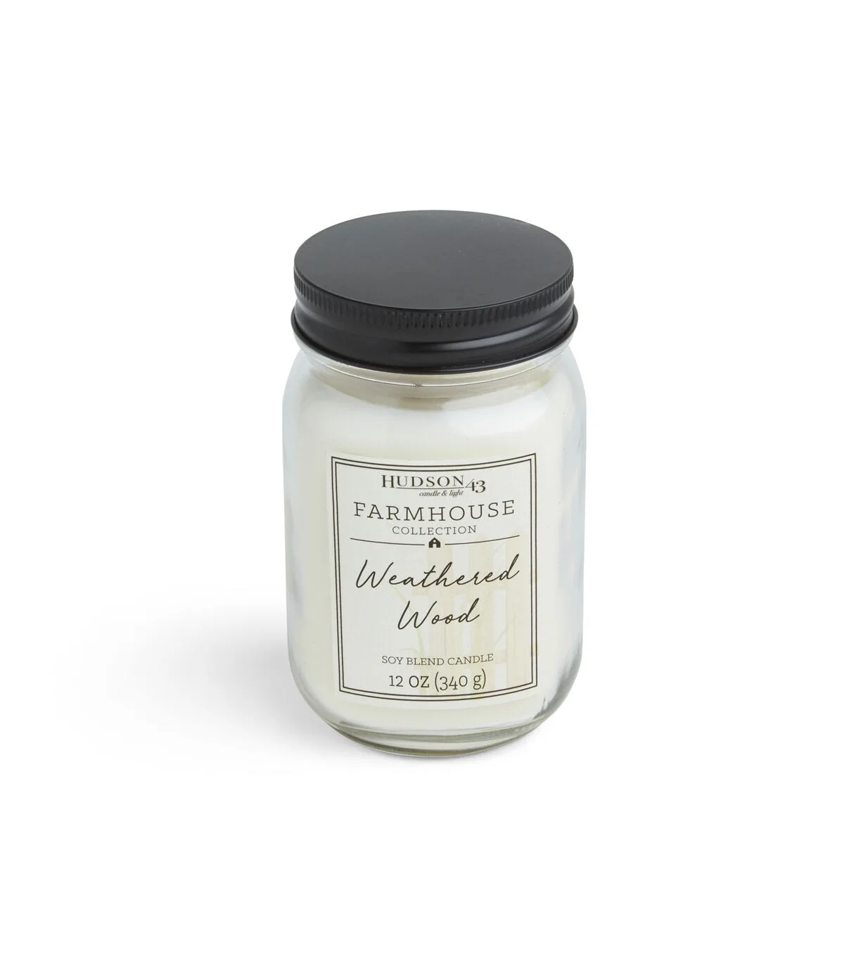 The Hudson 43 Farmhouse Collection Weathered Wood Mason Jar Candle offers a modern yet rustic fragrance in a beautiful package that goes with any decor. This 12-ounce clear mason jar comes with a white wax candle and a matte black lid that screws on. It includes the notes of sun-washed wood and fresh air.