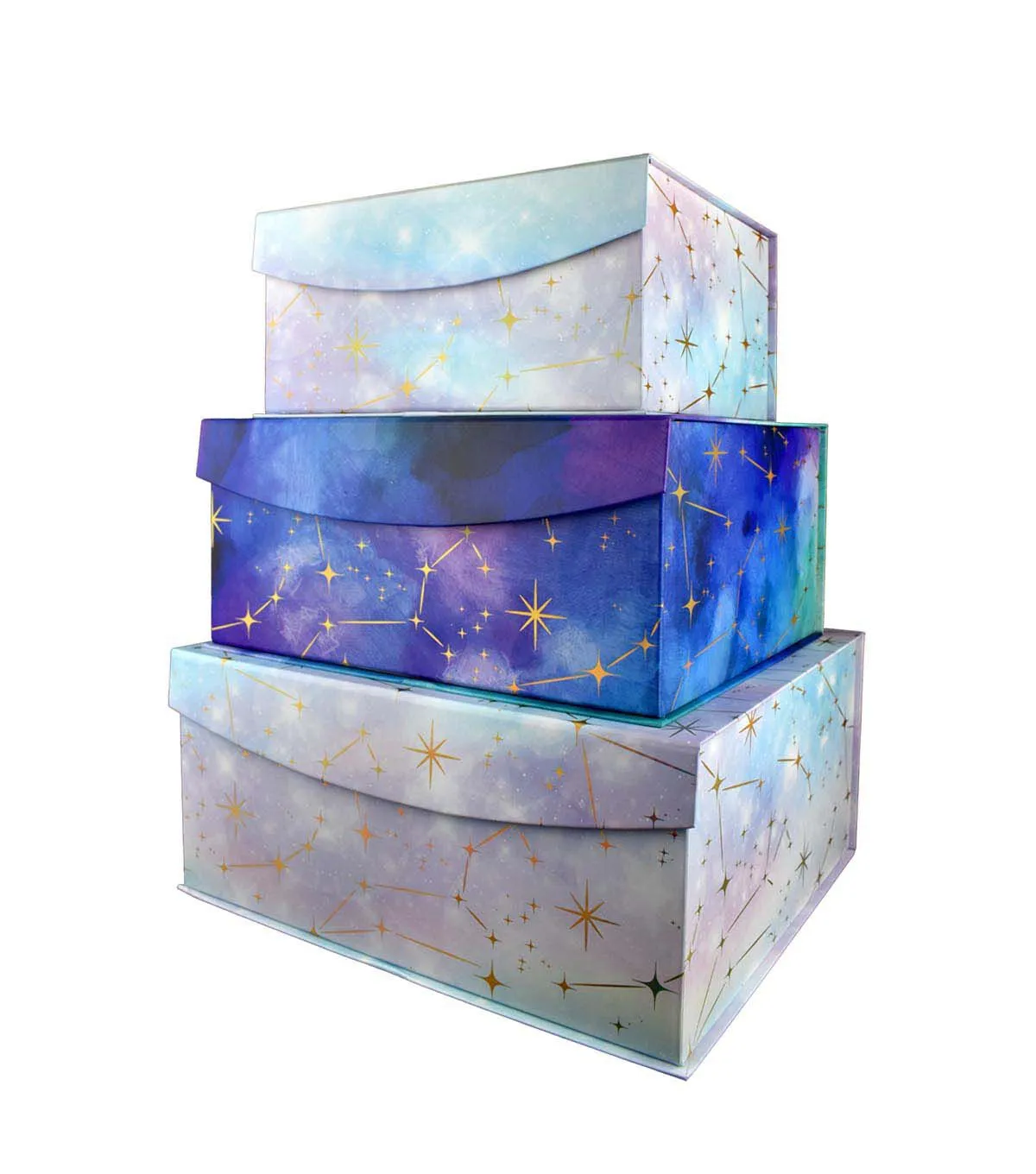 Looking for a fun and unique way to store your belongings? Check out this 14" x 12" Blue Holographic Gold Foil Flip Top Box by Place & Time! With its eye-catching holographic foil design, this box is sure to add a touch of fun to any room. Whether you're using it to store your favorite trinkets or as a decorative piece, this box is perfect for all ages.
