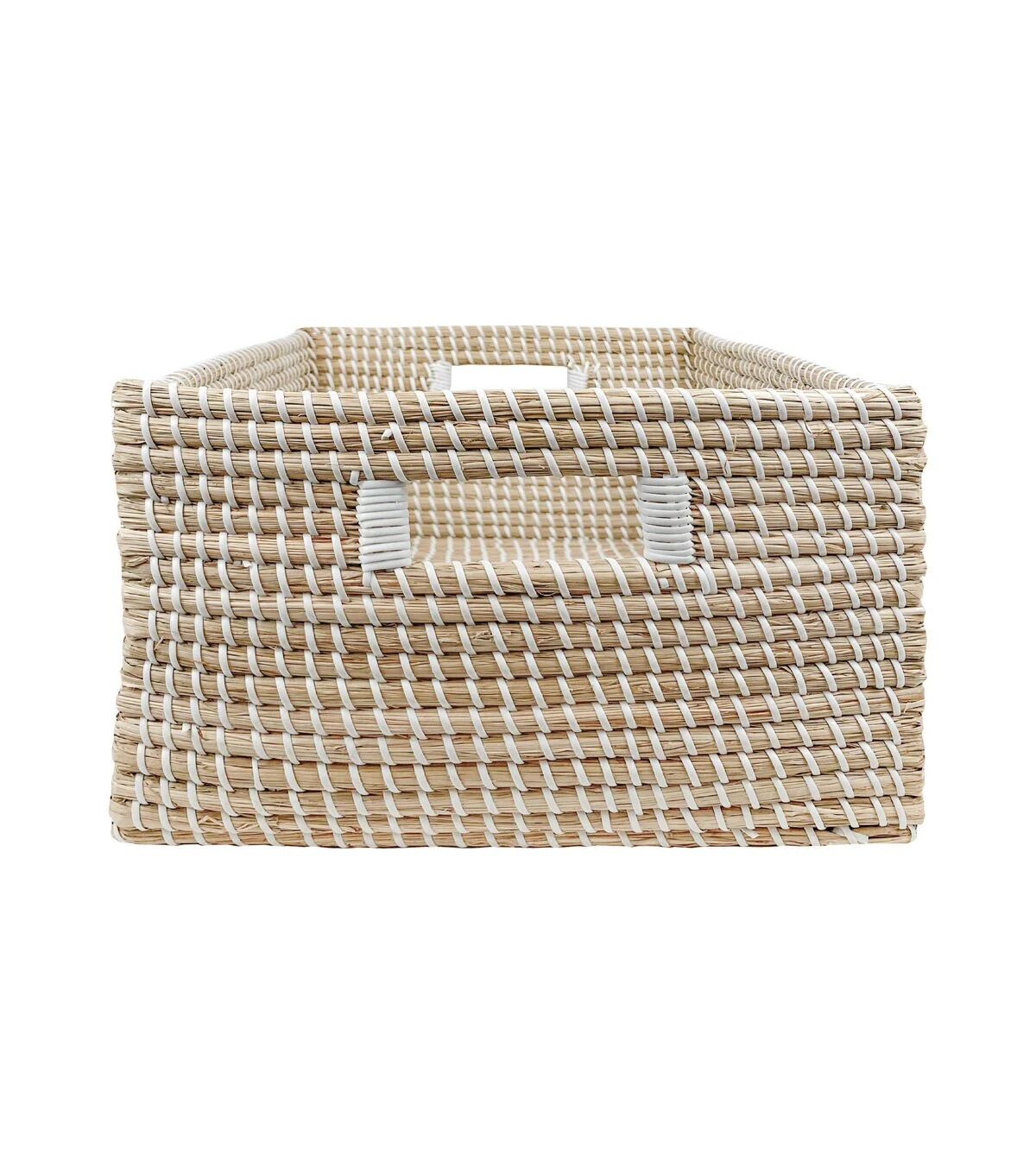 Give your home decor a rustic touch with the Natural & White Stitch Woven Basket by Place & Time. This woven basket flaunts a natural shade with white stitches. It is designed with cutout handles on two sides for ease of carrying. You can use it to store books and LED candles on the coffee table or towels in the kitchen.