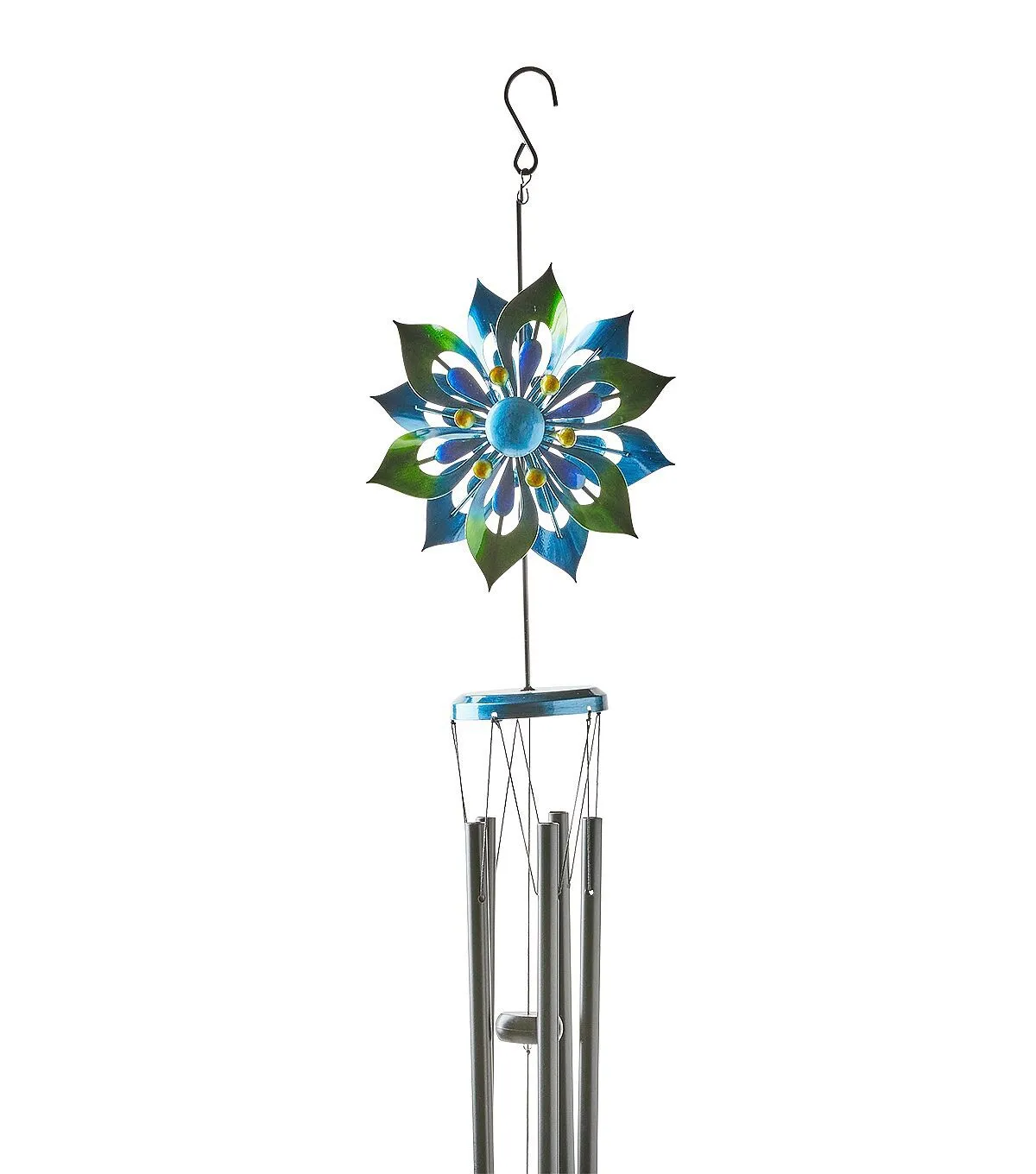 The Spring Blue Iron Spinning Flower Windchime by Place & Time is sure to add a musical ring to your seasonal home decor. This wind chime comes with a flower accent with cutout details and sporting gorgeous shades. Use the hook at the top to easily display it on the front porch to give your guests a stylish welcome.