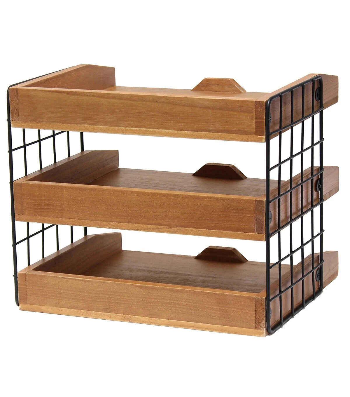Perfect for storing your paper, notes, mail, folders or other documents in this charming desktop metal and wood organizer. It features 3 wooden trays accented with black metal accents. Each tray can hold standard 8.5x11 paper. Perfect to add a touch of rustic chic to your home office!