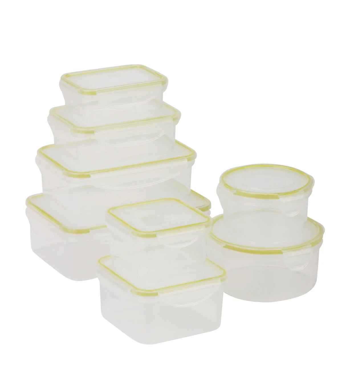 Honey-Can-Do KCH-03828 16-Piece Locking Food Container Set, Clear. This 16 piece set of food storage containers is perfect for storing leftovers, make-ahead meals and on-the-go lunches. Each container is 100 percent air and water tight. The set includes one 8-oz container, one 17-oz container, one 34-oz container, one 50-oz container, two 13-oz containers, one 23-oz container and one 30 oz container. A locking lid for each base completes the set. Dishwasher, microwave and freezer safe. When using in microwave, open closure clips on each side and open corner of lid to vent. Not for use in ovens, under broilers or on stove-top. BPA Free.