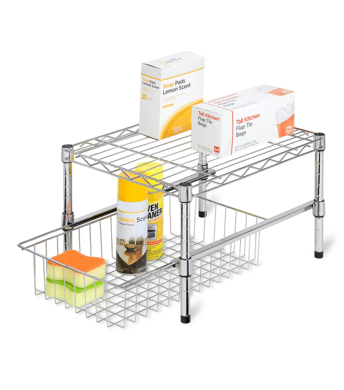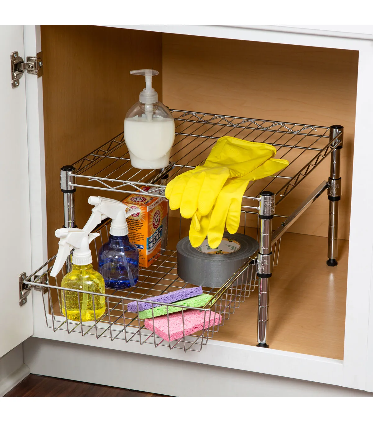 - A flexible storage solution that adjusts in height to accommodate tall or shorter items in most cabinets. Also good for pantry organization, the contemporary design and brilliant chrome finish present a polished look when you open your cabinets. Handy and sizable, the wire basket pulls out for easy access to anything from food items to under-the-sink cleaning supplies. This shelf works best in cabinets that are 18 inches wide or larger.