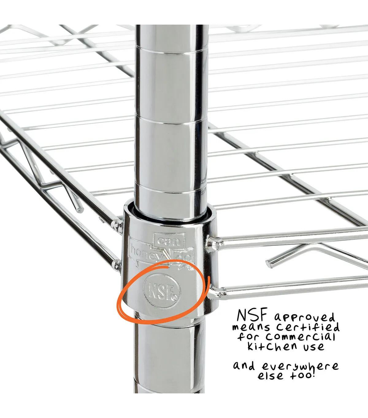 You are looking for a shelving unit that is versatile – that could serve as garage shelving or kitchen shelves. You need adjustable shelves for when your storage needs change or that oh-so-random item comes home and doesn’t fit on the shelves as-is. Well, your shelving ideas are just a click away. This 5-Tier Adjustable Chrome Storage Shelf is all that and more, with the ability to hold up to 250 pounds on each shelf and a steel frame construction that gives it industrial quality, making it the perfect kitchen, garage or closet shelving unit. And if you want to move it around, you can purchase wheels that will give you the portability you need, with the functionality and style you desire.