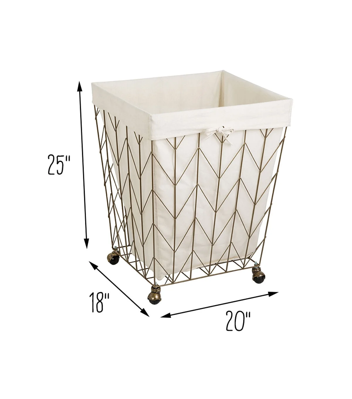 This hamper is what happens when you don't have to sacrifice form for function. The mid-modern chevron design on this bronze wire laundry hamper contrasts nicely with the natural cotton canvas liner. That liner can be removed easily and is machine washable, so it will always look fresh. And those wheels swivel 360 degrees so you can easily transport it from bedroom to laundry room. Check out the rest of our Coastal Collection decor for a cool and coordinated look.