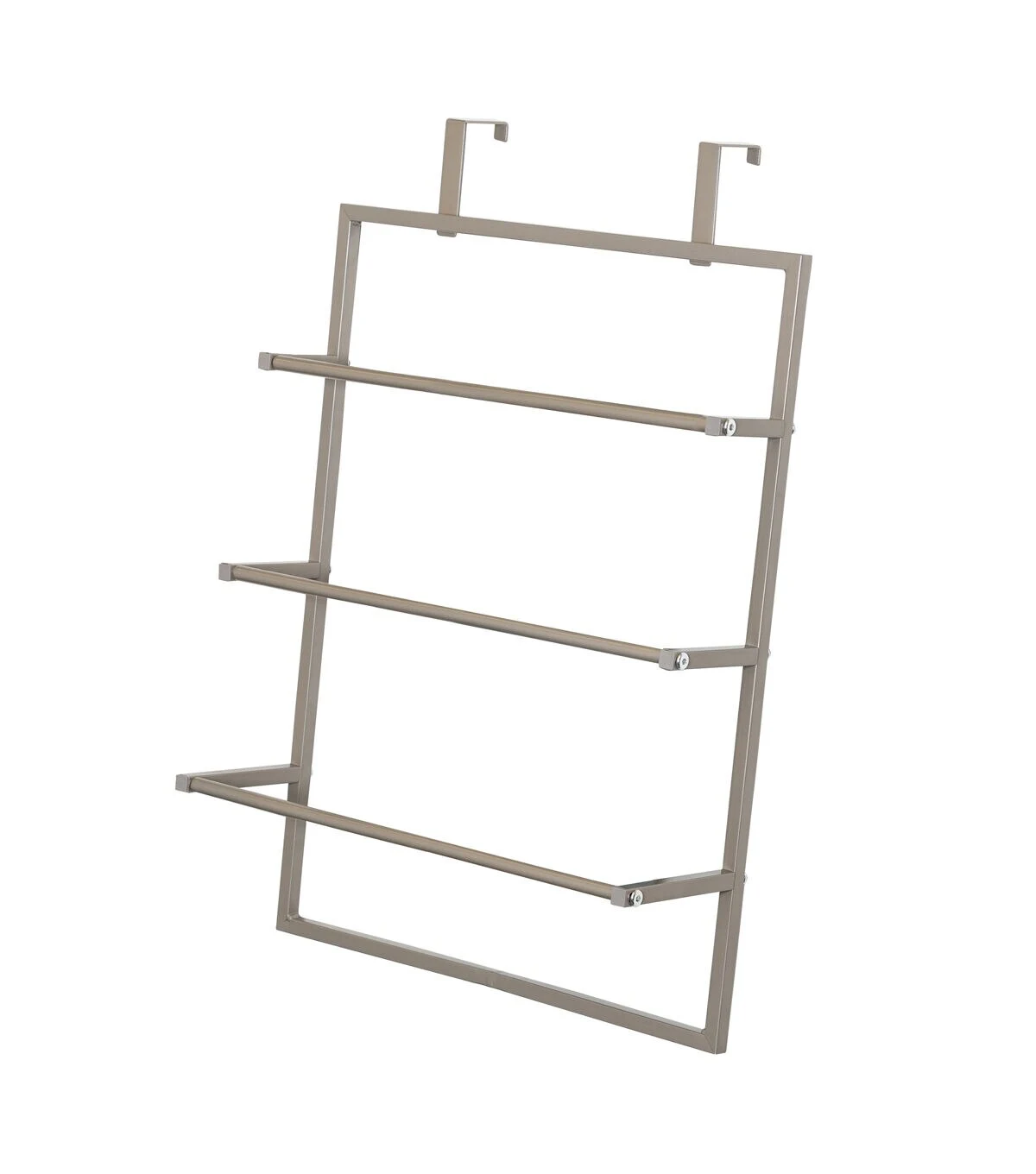 - Includes hooks to hang over door and 3 hang bars for towels