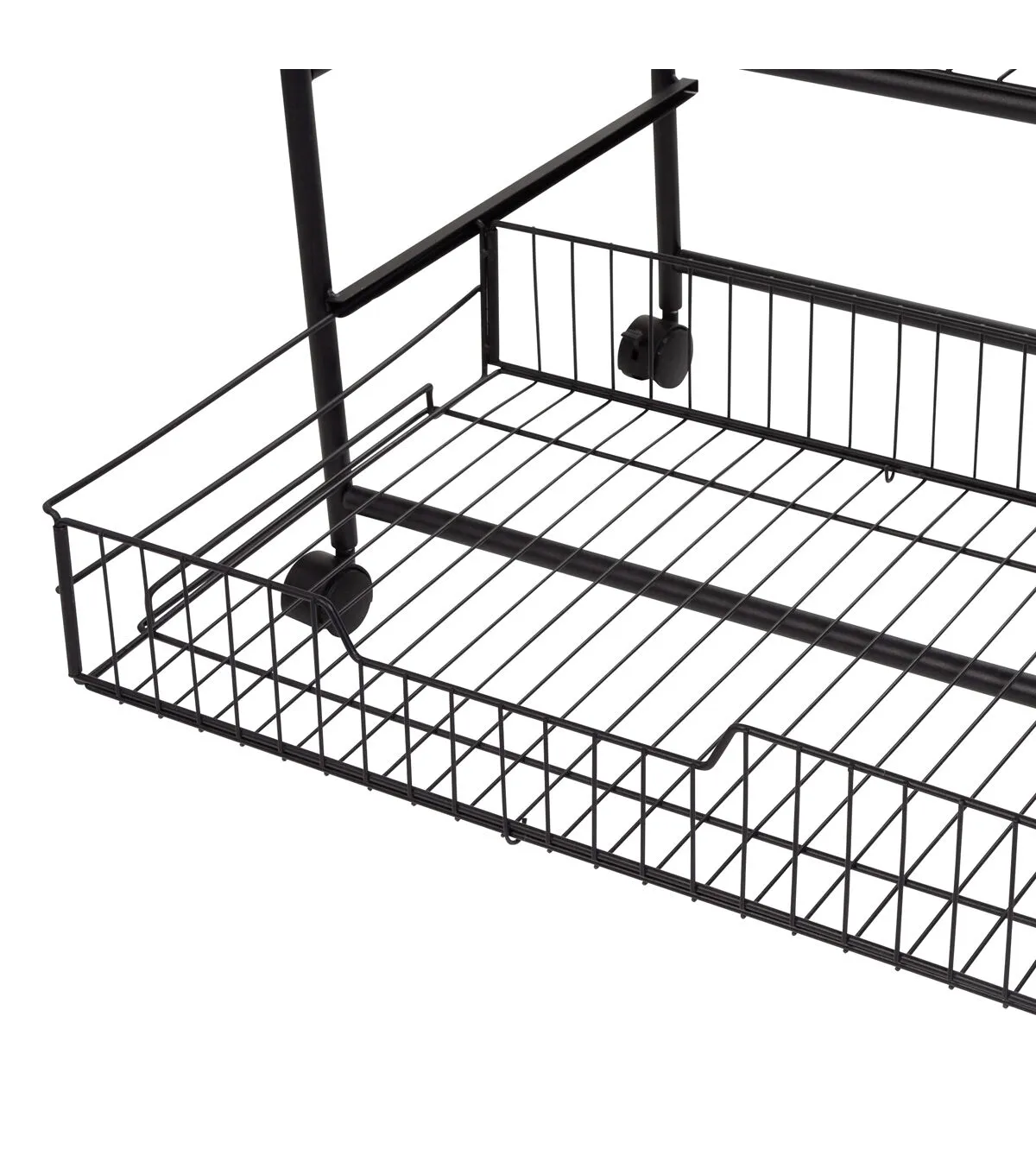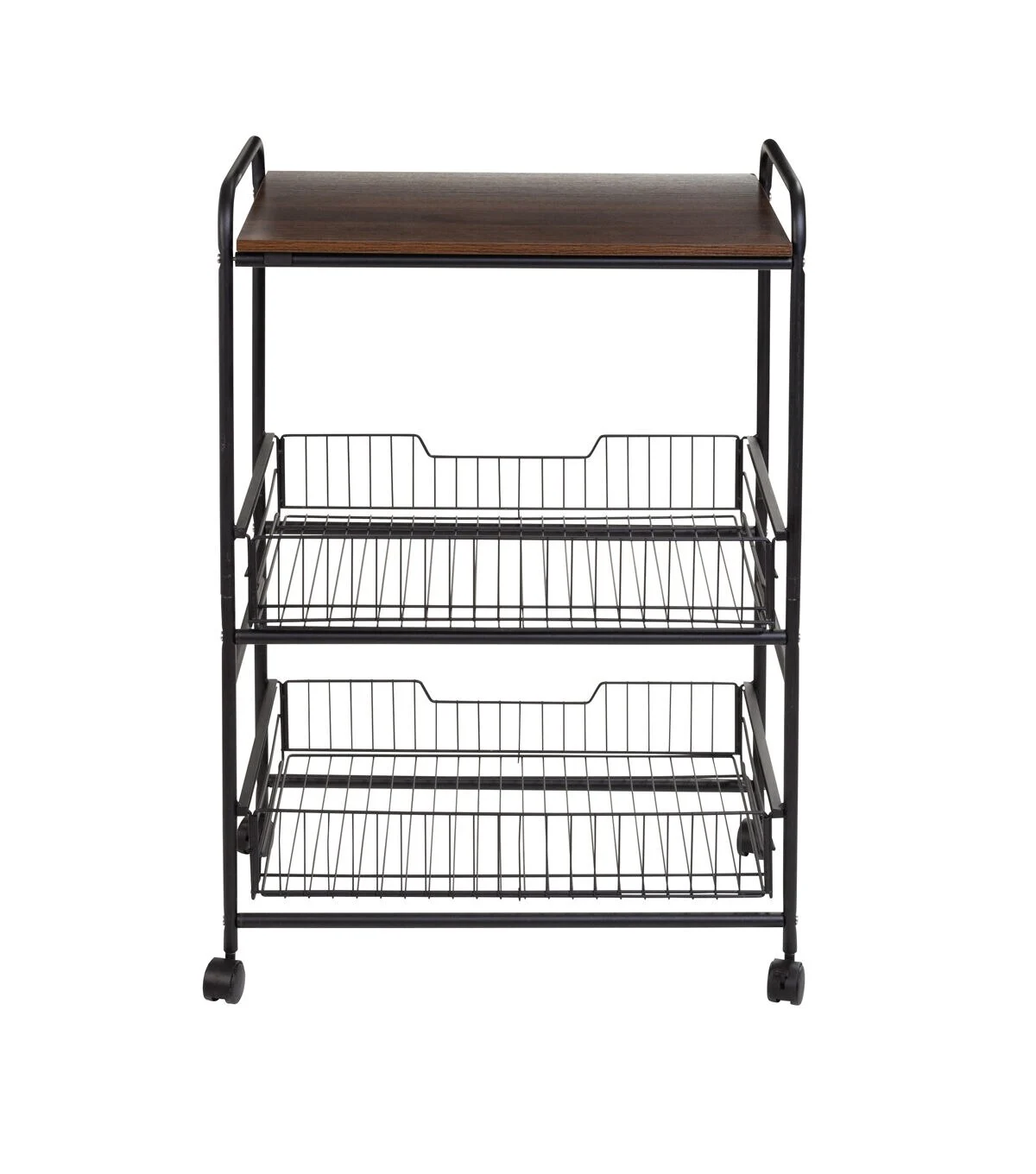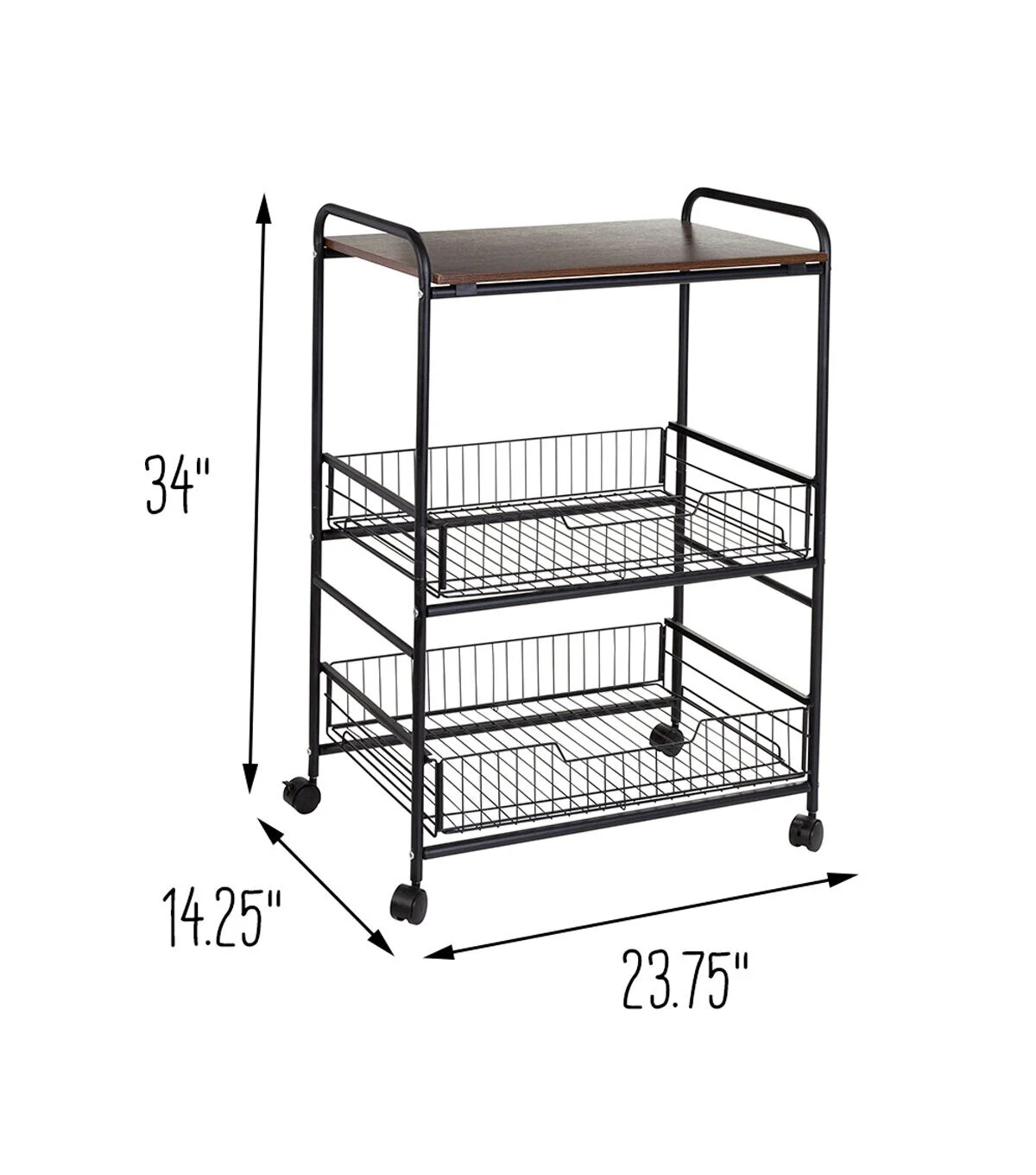 Whether used as a microwave stand or a farmhouse rolling cart, this 3-tier cart is crafted to organize your home in style! The top shelf finished in a warm natural tone can hold everything from plants to art supplies, while the pull-out baskets are ready to organize your clutter. The wire baskets will keep everything corralled while this cart is on the go. Once stationary, the open design and slide-out function allow you to see exactly what you have on hand and easily access it. Its simple wood and metal build offer a timeless feel that transcends trends, while its durability offers endless years of organization.