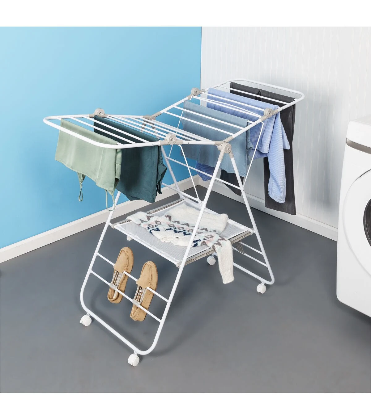 The only thing better than a large and versatile drying rack for clothes is one with wheels. A pair of wheels takes the portability of this wing drying rack soaring to new heights with their easy glide function that makes wheeling clothes from point A to B a breeze. Don’t worry; it still includes all the great features of the original Wing drying Rack with 42 linear feet of drying space that can hold 18 to 20 garments. The patented design also features smooth fold hinges that allow the wings to fold out into multiple positions for maximum drying space. It also boasts shoe racks that will keep your kicks in shape as they dry and a mesh shelf for those delicate pieces that need to be laid flat to dry. Once everything is ready to be folded, the A frame folds flat to 3” for easy storage.