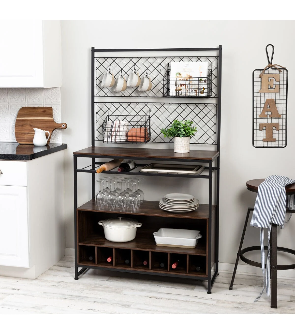 The perfect kitchen companion, this bakers rack will open up countertop and cabinet space and allow you to store large and small kitchen necessities all in one place. A row of wine bottle storage at the bottom of the rack is an added feature that holds 7 bottles of wine. Thinner shelf spaces are convenient for storing baking sheets and cutting boards, while standard shelves provide ample space for a microwave or a mixer. A wire grid backing with two baskets and five "S" hooks provides vertical storage space for holding spices or hanging spoons. This multi-funtional all-in-one bakers rack has a sturdy steel frame that will allow it to keep you company in the kitchen for years to come.
