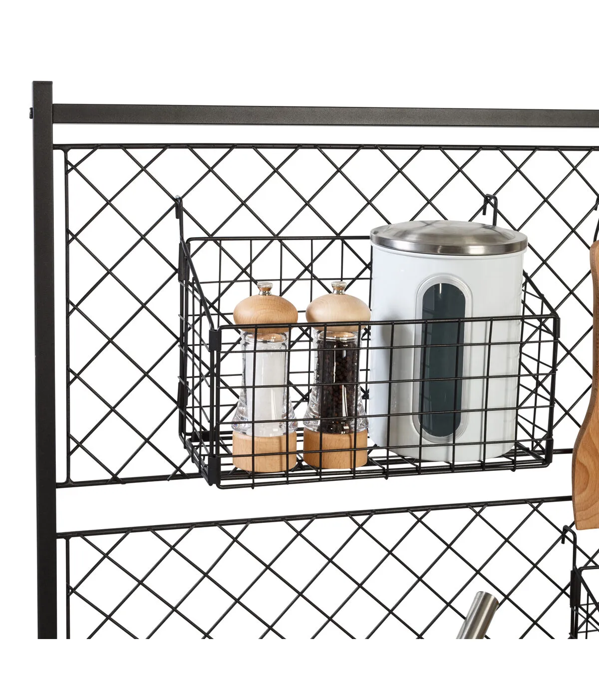 - Wire grid includes two removable baskets and 5 “S” hooks for hanging accessories