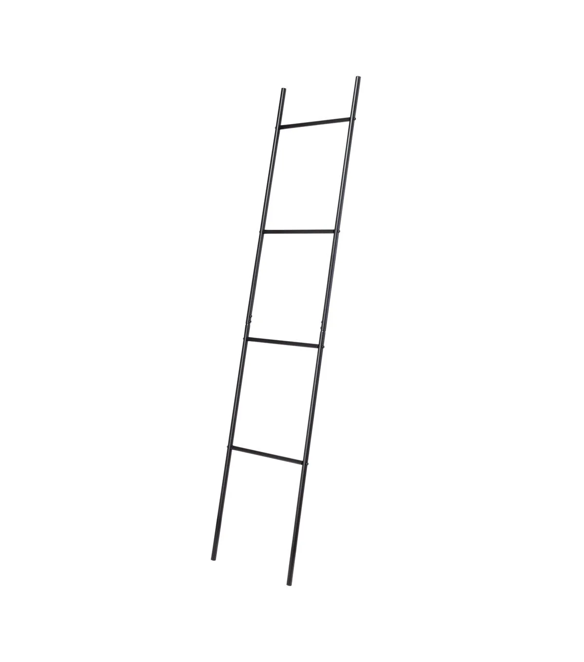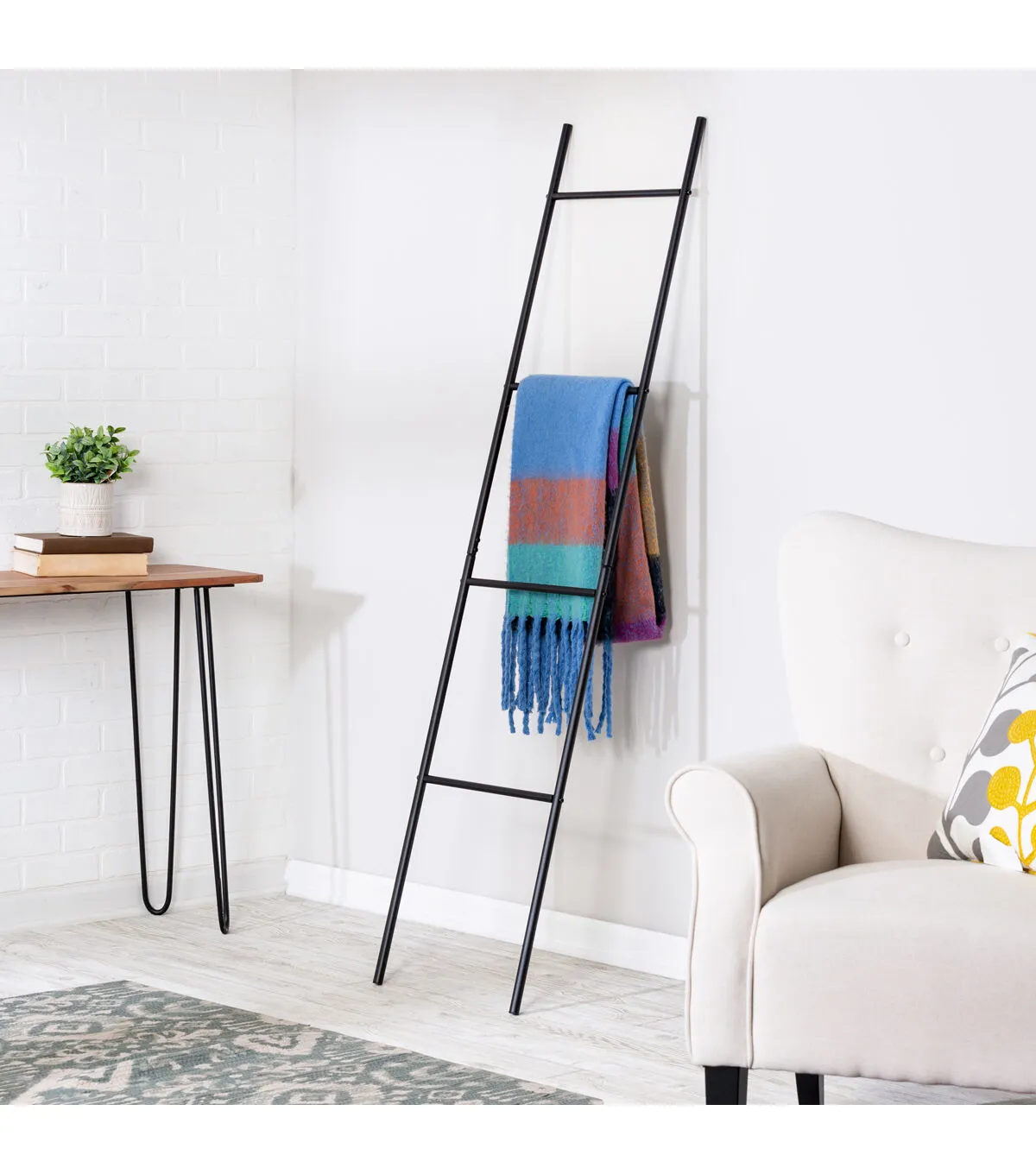This ladder rack leans cleanly and is a welcome design and storage addition to any room. Keep throw blankets, towels or clothing accessories close while giving your space a fashionable decor accessory of its own. Clean, symmetrical lines on this open-air sleek black steel frame provide a simple, yet sophisticated look to your space.