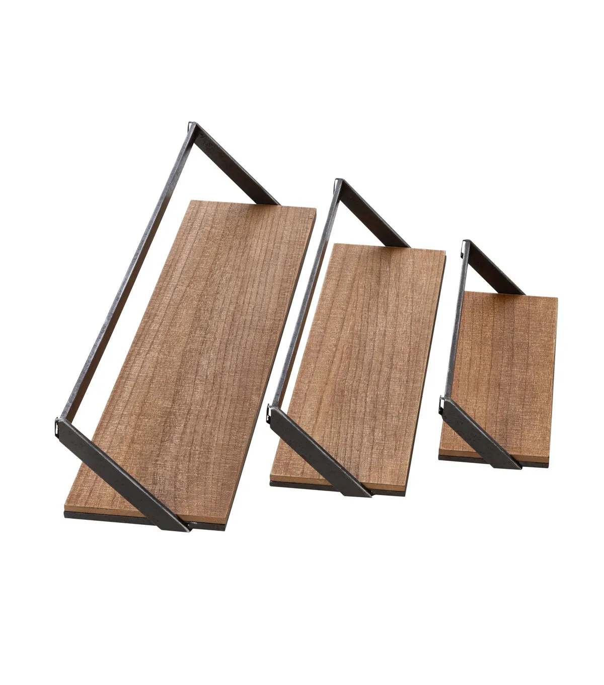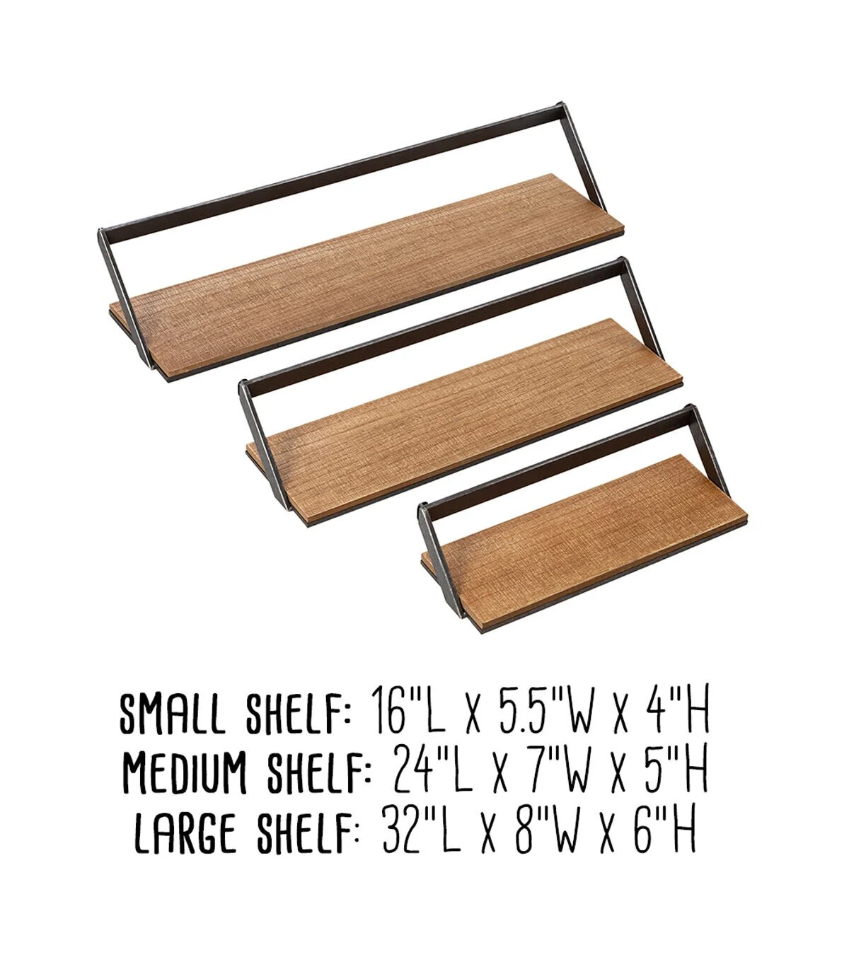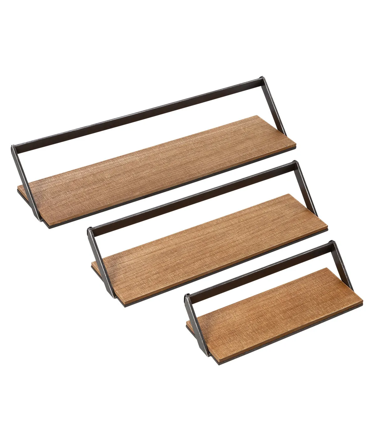These shelves are for things that brighten and bring joy to a space. Think framed photos that freeze unforgettable moments from family vacations, funky ceramics that pot interesting succulent house plants, or special mementos or heirlooms that harken past adventures. Since they’re floating shelves, they lend a lighter presence on a wall than a traditional bracketed shelving unit. Even with a sturdy mixed metal and wood construction, these aren’t shelves for volumes of heavy tomes. Instead, select those special items that pair well together on the set’s large or medium shelf, or let an extra sentimental object shine solely in the spotlight on the small shelf.