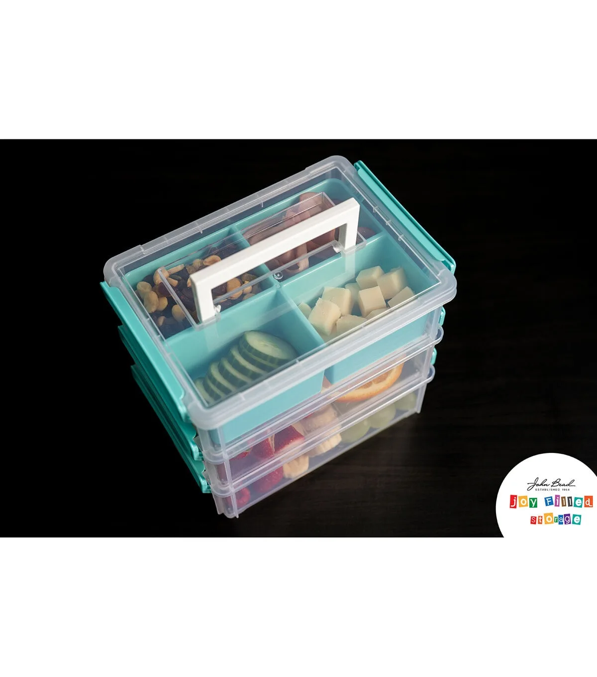 - The food grade containers can hold a large quantity, and variety of food with the separate compartments making party clean up smooth, quick, and easy. The pop of turquoise on the lids of these clear containers, as well as the aesthetically pleasing linear stacking of same sized containers will look excellent in the fridge or pantry.