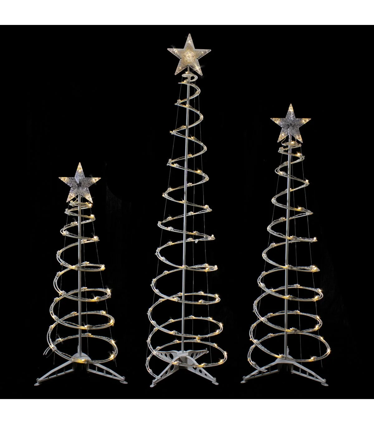 Create your own wonderland by effortlessly adding a soft warm glow with our spiral-shaped Christmas trees a classic for holiday lawn decorating. This set comes fitted with warm white LED lights that are UL listed for both indoor and outdoor use. Perfect for any area of your home or yard that needs a special holiday touch. The easy assembly allows for a quick and effortless setup and the included lawn stakes allow you to secure the trees into the ground.