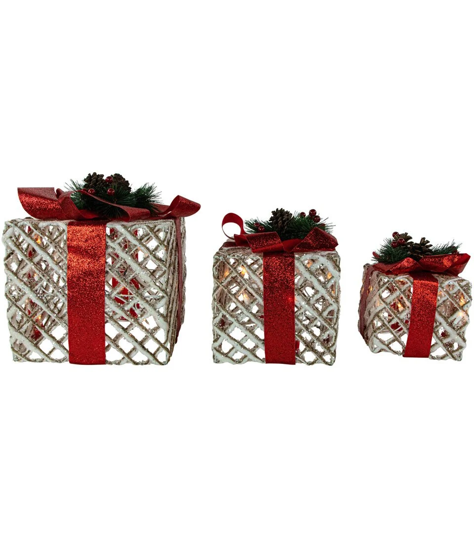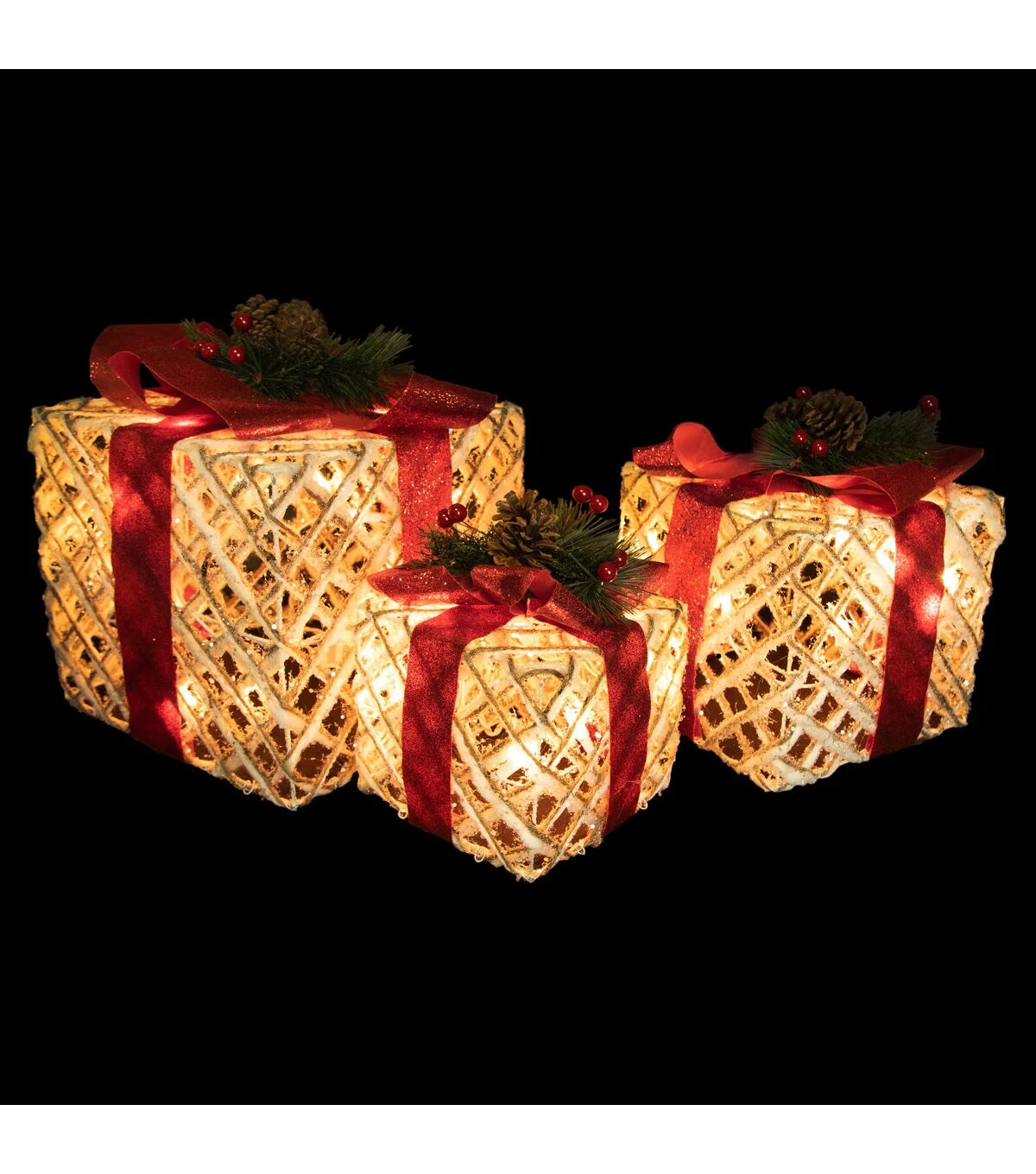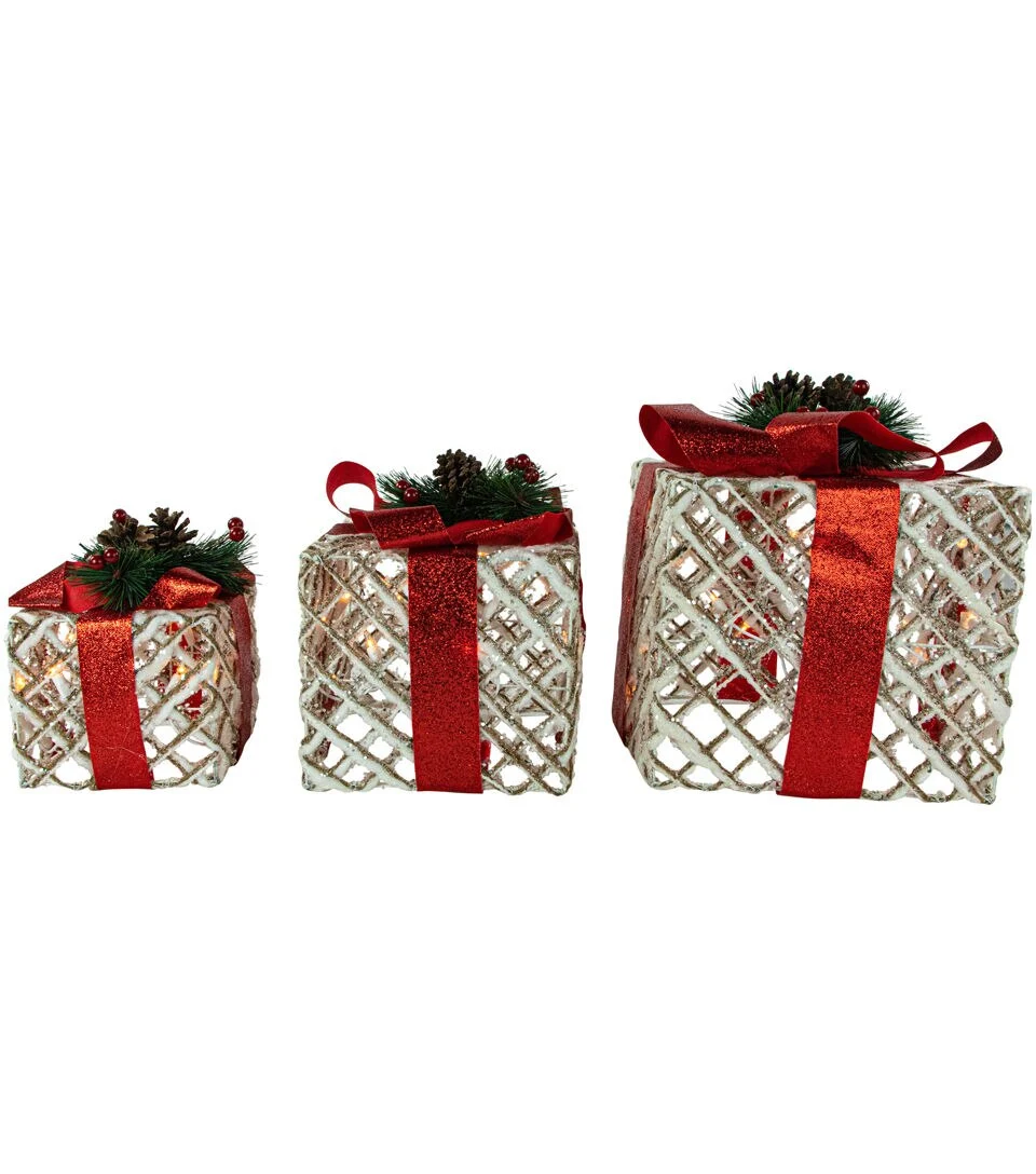Get into the holiday spirit with this gift box set. This set features elegant-looking pre-lit gift boxes embellished with holly berries and leaves and red bows. These will be the perfect addition to your porch entryway tabletop or anywhere you wish to add a little holiday charm.