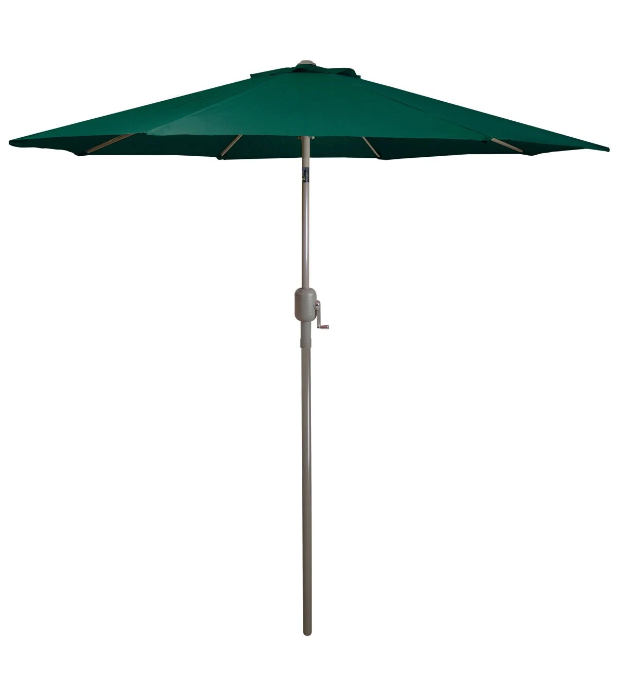 Stay shaded and cool this summer with our moderately sized market umbrella. Ideal for covering a 48-inch or four-person dining set. Features a sturdy powder-coated aluminum frame with steel ribs built to last a lifetime. The crank opening and push-button tilt mechanism allows for ease of use. Features: Umbrella shape: octagon Canopy color: taupe Frame and pole color: brown Diameter of open umbrella: 9' Height: 8' Pole diameter: 1.5" (38mm) Lift: hand crank Tilt: push-button tilt 8 ribs Material(s): 160 gram polyester canopy/powder-coated aluminum pole/steel ribs Note: Umbrella only base is not included