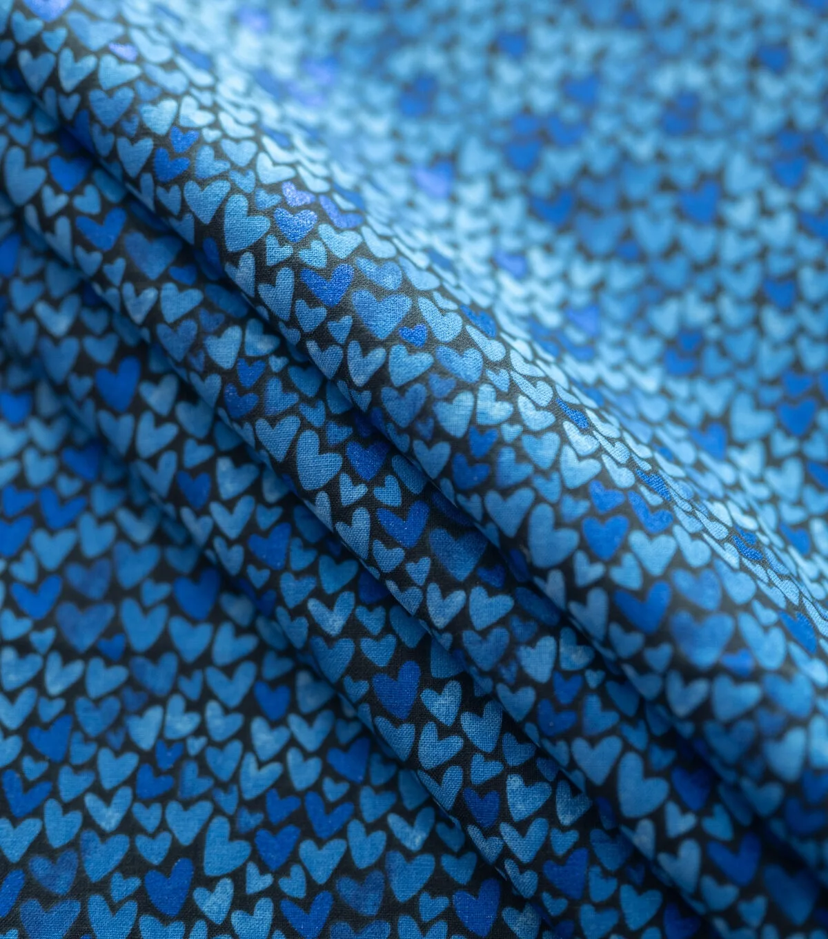 Get Cozy with the Packed Hearts Blue Quilt Foil Cotton Fabric by Keepsake Calico