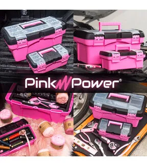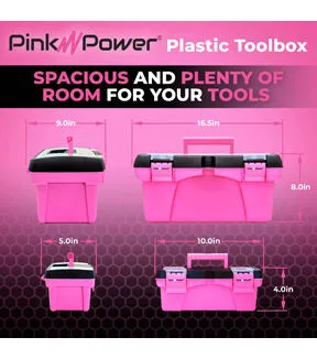 Our 2-pack 16” and 10” toolbox is perfect for keeping all your tools portable, organized, and in one place. Each tool box organizer features top compartments on the lid to help keep small parts and frequently used hardware or accessories accessible. This pink tool kit for women also includes a removable middle tray to help separate smaller tools from larger tools when storing. The middle compartment is perfect for organizing sewing supplies, paintbrushes, and craft accessories. The inside compartment is large enough to store multiple paints, larger sewing supplies, smaller swatches of fabric, beads, and more while the mini tool box all of your small accessories. This pink tool set comes with two plastic latches to keep the box shut and secure. And, as will all Pink Power tools, it comes with a full three-year warranty.