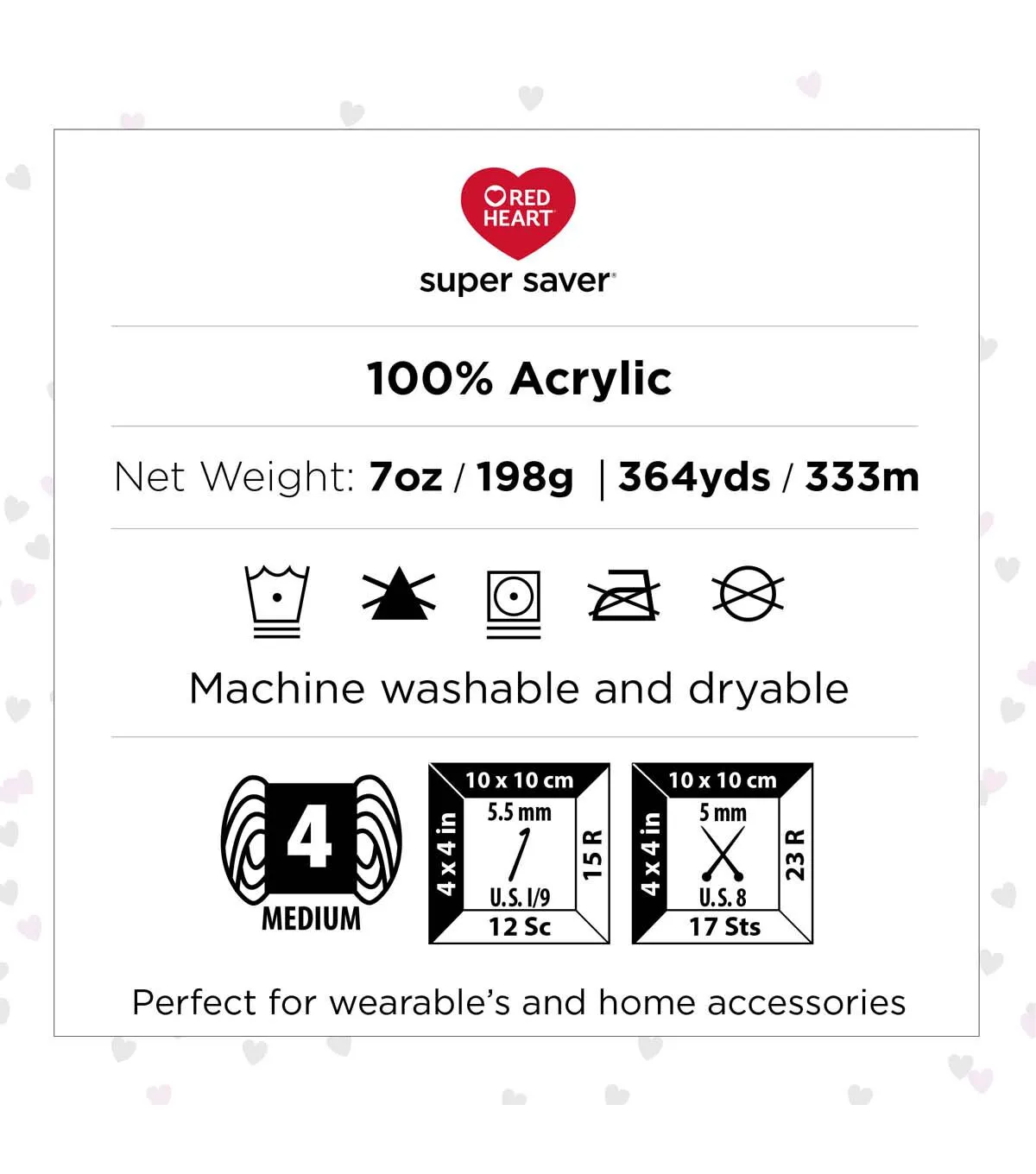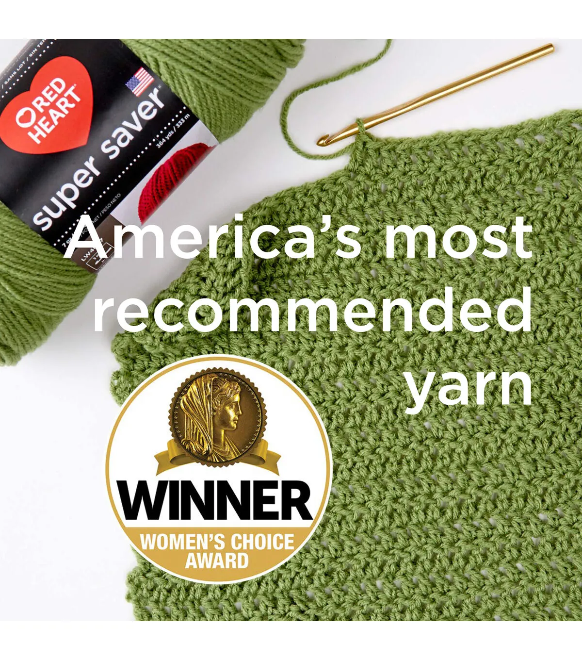 Super Saver yarn has been a favorite among knitters and crocheters for over 30 years. This 100% acrylic worsted weight, size 4 yarn comes in over 120 beautiful colors, so you will always find the perfect color to complete your project. No-dye-lot solids mean all skeins of a solid color match, so it’s easy to buy another skein and continue the project. Plus after you make your project it will be made to last, as Red Heart Super Saver yarn is durable and will stand the test of time, wash after wash. This product holds the OEKO-TEX Standard 100 certification.