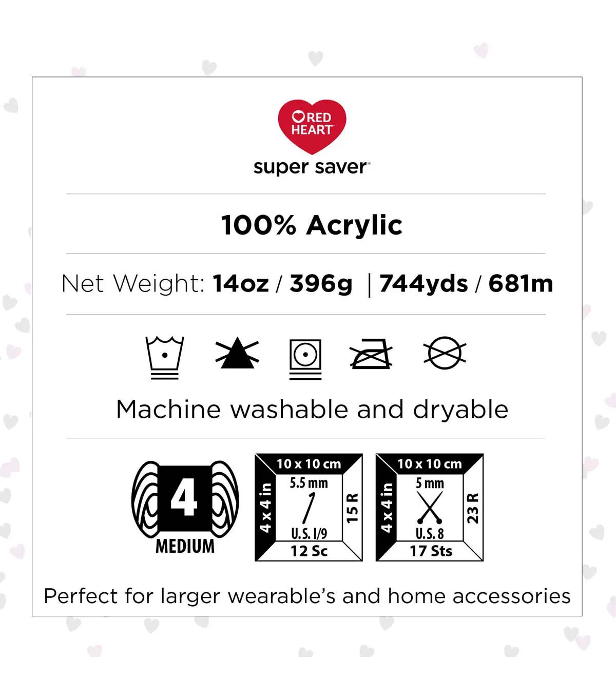 Red Heart Super Saver Jumbo yarn is the same Super Saver yarn you love in larger skeins. Each Super Saver Jumbo skein is the size of two skeins of the regular Super Saver, so you have half as many ends to weave in. Just like Super Saver, Super Saver Jumbo is Made in the USA and has no-dye-lot solids. Super Saver Jumbo is ideal for sweaters, afghans, and other projects requiring large quantities of yarn. This product holds the OEKO-TEX Standard 100 certification.