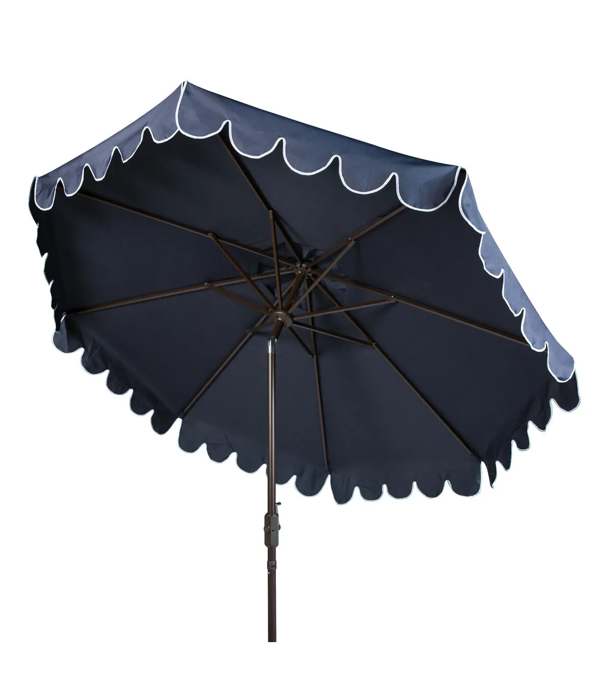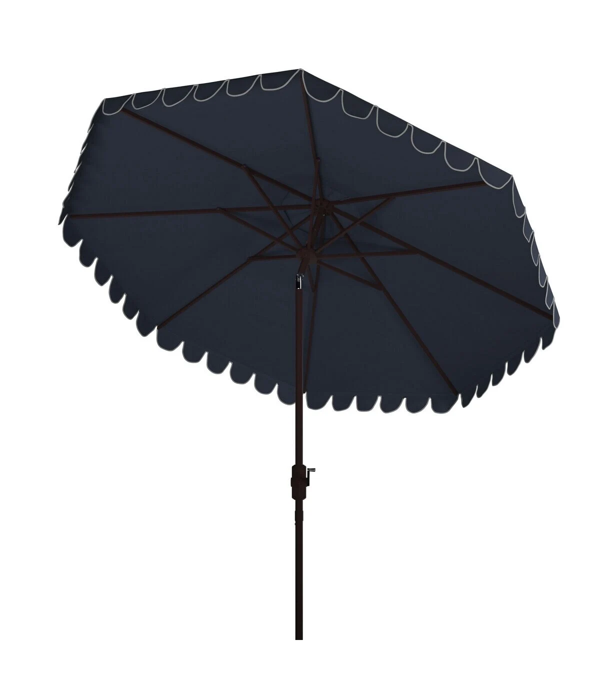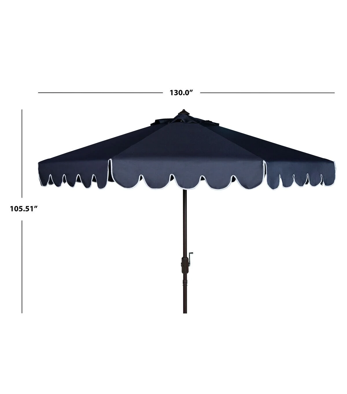 The signature white and blue coloration of Santorini��s lush legendary resort inspired this eleven foot crank umbrella. Its sophisticated navy hue features a scalloped white trim to create an outdoor retreat for the modern tastemaker.