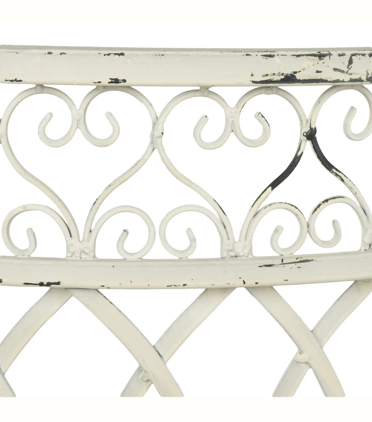Designed after a Victorian garden staple, this Lara Kissing Bench overflows with vintage charm. Lara's romantic heart shaped details and flourishing scrolls in antique white iron lend any outdoor space an enchanting ambiance.