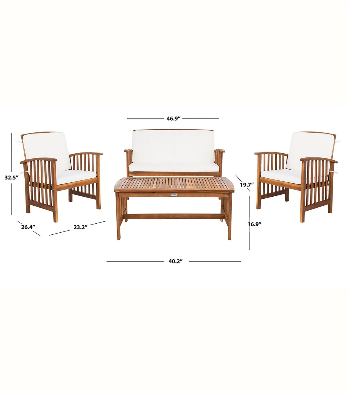 The open and airy design of the Rocklin 4 piece outdoor set combines form and function. The slatted silhouette aids rain drainage while creating chic contemporary forms. The set is crafted of acacia in a brown finish with beige all weather cushions.