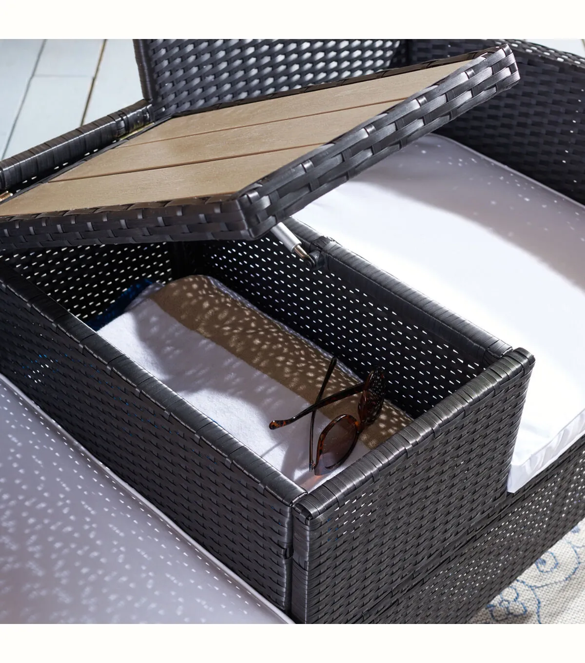 Form meets function for outdoor living in this Viora Loveseat. Viora��s subtle curves and clean lines are wonderfully highlighted by its modern black wicker details and plush white cushions, and a built in box with a gas lift provides discrete storage on the porch or patio.