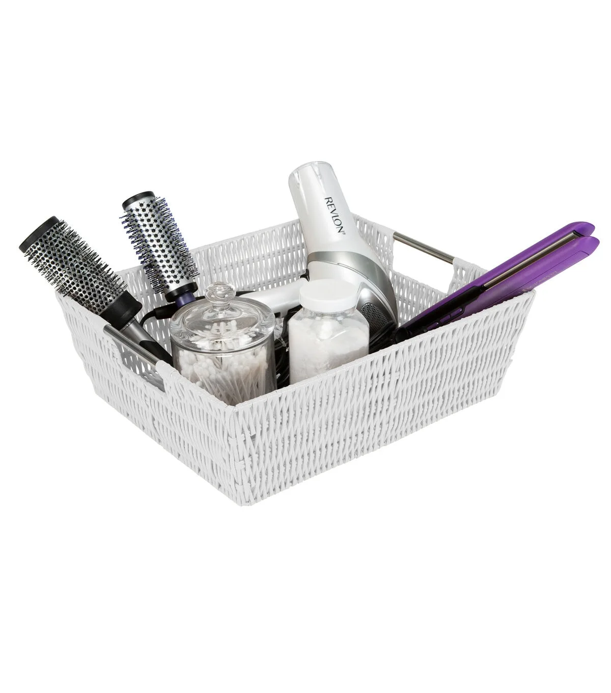 Organize and create storage in your home with the Simplify Rattan Tote Basket Collection. Simplify's Rattan Tote is a PE Basket with an iron frame and 2 sturdy stainless steel carry handles. It is strong and durable prolonging it's life, and it's lightweight design makes it easy to lift and carry. Fits any home decor with it's wide selection of colors. Store your household belongings and organize space with these stylish baskets. Stack them together in a corner of your craft area, home office or Dorm to keep your essentials close at hand in an organized manner.