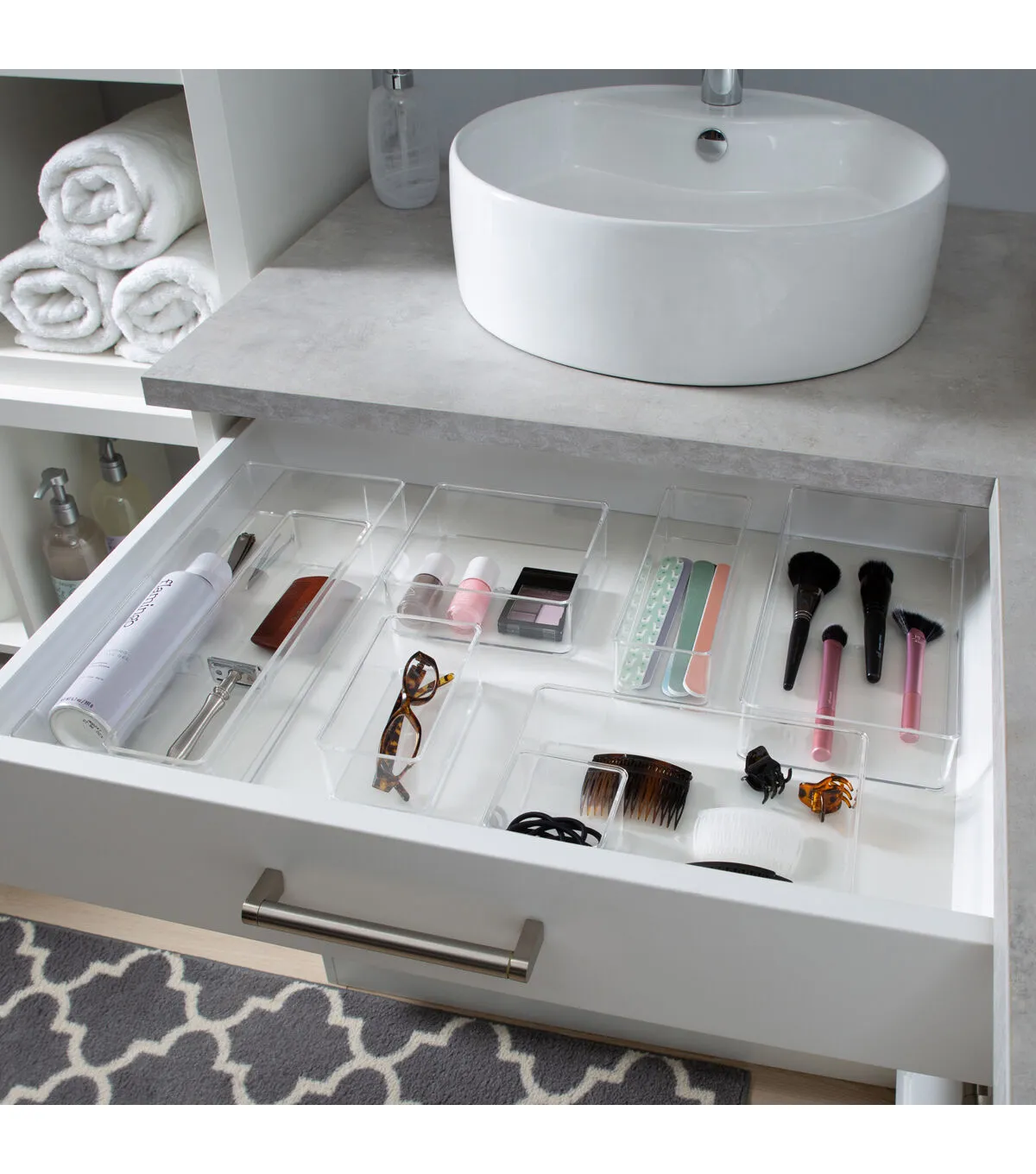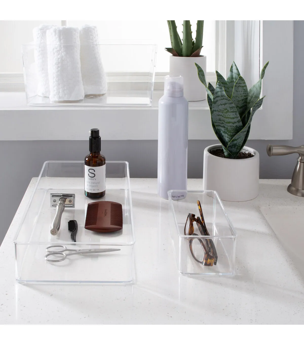 Organize your bathroom vanity or desk drawer with this Simplify Small Narrow Drawer Organizer. It is the perfect size for desk accessories such as pens, paper clips, and markers. It is also good for holding jewelry and cosmetics. The clear design makes items inside visible and easy to find. You can keep this transparent organizer bin on your desktop or countertop surface because it fits with any room’s décor. Organize the little things in life with the Simplify Drawer Organizer.