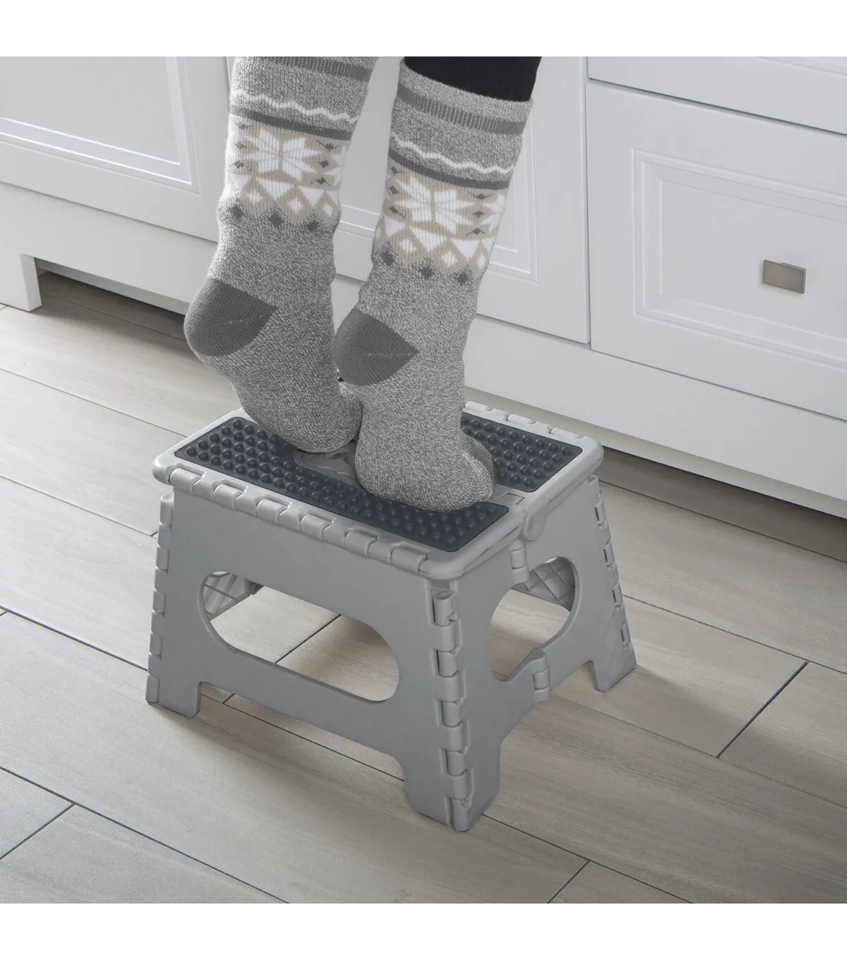 A must have in any home, dorm or office, the Simplify Folding Step Stool. With an easy carry handle you can conveniently transport the stool to any room in the household. With the 9 inch height and weight capacity up to 200lbs, this stool can hold children and adults. The anti-skid foot pads keeps this item safe to use. When not in use the stool easily folds away for storage.