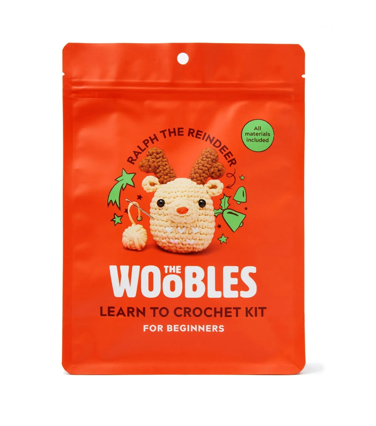 Introducing Ralph the Reindeer - The Woobles Reindeer Crochet Kit. The Woobles Reindeer Crochet Kit is perfect for beginners! The kit includes all the materials you need, plus step-bystep video tutorials that expertly guide you through each stitch and technique that matches the kit in your hands. These tutorials are designed to take the stress out of starting your project and make it easy for new crafters to dive straight into the fun. In addition to the video tutorials, the kit includes everything you need to get started on your crochet journey; - Pre-started reindeer character - Custom-made Easy Peasy yarn that cannot fray - 4mm crochet hook - Stuffing - Plastic eyes - Tapestry needle - Stitch markers With this kit, you'll be able to create an adorable reindeer that you can keep for yourself or give as a heartfelt gift. The skills you learn from this kit will enable you to crochet a wide range of other projects, including other Woobles!